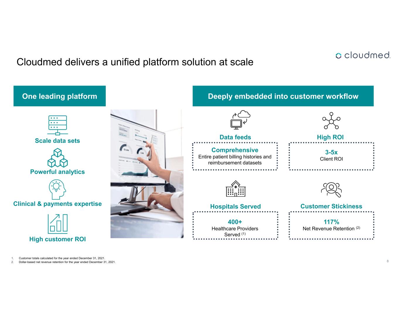So the next slide, this is an intro into the how. So Cloudmed delivers a uniform, unified platform at scale. And when we say platform, we mean what's on the left side of the slide. I've already talked about data. I'll talk about algorithms and machine learning that applies predictive trending to payments. And then equally important, is the staff we have that are experts in clinical coding and reimbursement. So that's that third point. Super important to deliver high customer ROI. And then on the right, an intro into the value and how we deliver our solutions to customers, comprehensive data feeds, high ROI, we'll do this math when we get to our customer incentive model, and that leads to lots of hospitals serves, 400 plus hospitals serves, served and very high customer stickiness.