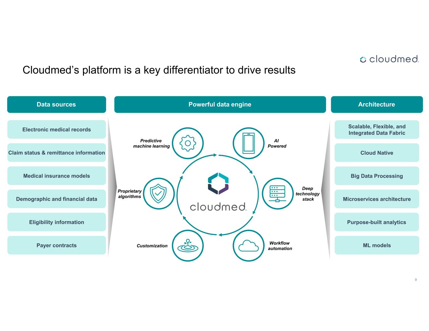 So let's do a little bit of a deep dive into data and the nature of our tech platform. This is for our team, one of the core reasons why we are able to deliver premium results to our customers, why we're able to compete against a market that is largely point solutions, and why we deliver to our customers something they wouldn't be able to solve on their own. So on the left, I'm not going to read the words, you see data sources. These are data sources, again, across all U.S. payers. So we understand the models of U.S. payers apply to specific states, specific types of coverage, etc. These are hospital systems and physician groups and every state, and again across all types of coverage. You see the picture in the middle. One of the advantages we have of having brought together several companies over the course of the last five plus years at Cloudmed is we were able to start from scratch to build a modern technology stack with associated architecture. So you see on the right, a scalable, integrated data ingestion engine. This is super critical because of the types of datasets you'll hear us talk internally about a unified data specification, a key value driver of being able to onboard a customer very quickly. Cloud Native, we have classic, modern big data processing, and then purpose-built analytics for healthcare specific data sets, charges, billing, reimbursement, etc.