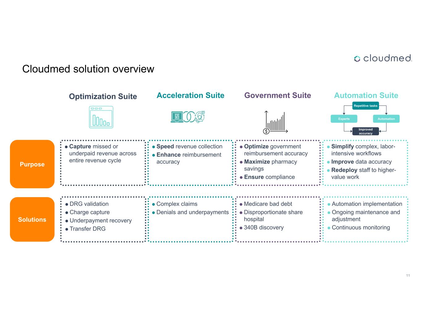 So let me go through a couple examples of our products. So you can see them on our website, but I thought it'd be helpful to give you a few examples of exactly what do our solutions do and why are they such high value to our customers. So slide 11 here is an overview of how we talk about our solutions from left to right. Our Optimization Suite, which you can see, it's not on this slide, but this is the largest portion of our revenue today, is capturing missed or underpaid revenue across the entire revenue cycle. And so you see the product names we use. I'll give an example of DRG Validation and Charge Capture on the next two slides. These are products that have robust sets of code, claims, reimbursement analytics embedded in them that allow us to identify sources of missed revenue. Acceleration is exactly what it sounds like. It's us helping a provider get cash in faster. Government Suite is what it sounds like. There are obviously complex regulations of sort associated with CMS, Medicare, Medicaid. We have solutions that help customers solve some of the more highly complex problems associated with compliance. And on the very right, Automation Suite. This is one of several places where there's a connection point with R1. We both talk a lot about automation. One of the reasons why the combination is so powerful is we also have 26 million automated tasks, a lesser number than R1, but for us, we've had a commercial model that extends to our customers outside of our own customer base. So a very exciting thing as we think about the two companies together.
