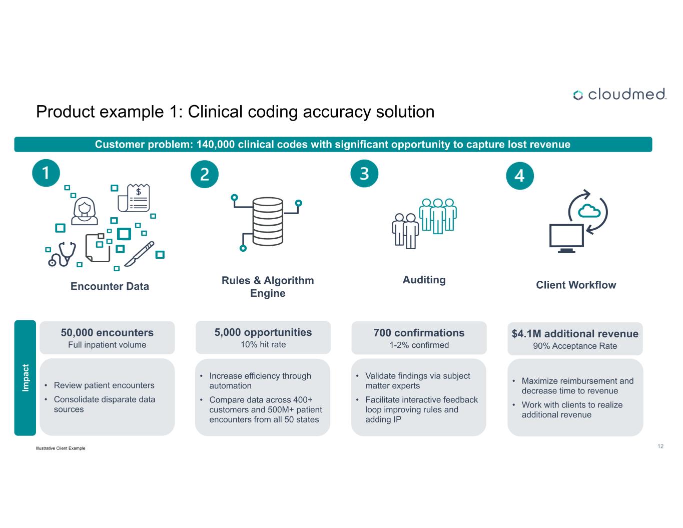 So let me give you two examples of how our products work. And the themes here will be complex data problem, high-powered analytics to solve that problem, streamline delivery to customers, and then incremental revenue delivered to our customers. So this is an example of a clinical coding accuracy solution. This is what we internally would call our DRG Validation solution. The customer problem, this is one hospital system, is there are lots and lots of clinical codes they deal with on a monthly, annual basis. So in this case, 140,000 clinical codes that are embedded throughout their system. The first challenge is there, for this particular system, there are 50,000 patient encounters. So this is the number of times they will see a patient. They need to review them, they need to consolidate these data into what are usually disparate data sources. This is the full inpatient volume. We then apply rules to that volume. Let's just make this real and bring an example. I live in Atlanta. We use Emory as our health system. If I were to go in for a knee surgery, and there were an implant. And let's just say for argument's sake, this is an inpatient visit. Emory has no way of understanding what the pricing trends are for that knee surgery or payment trends more appropriately. And I happened to be covered, let's say by Aetna. All they see is Emory data, so they have no idea of the payment trends for knee surgeries for my demographic, for an inpatient setting, covered by Aetna. If a similar patient that has my demographics, inpatient, and so on, is in New York, let's just say covered by Aetna, but with New York Presbyterian, another large system, the hospitals have no way of understanding payment trends. The power of our analytics is we see the trend on that knee surgery for that payer, for that inpatient setting, in my case a commercial plan, all across the country and can identify anywhere there are discrepancies for that knee surgery. And so what you see here on the second box is we have a host of algorithms or rules that identify multiple if then statements leading all the way to machine learning statement, machine learning models, which predict, okay, this is what's happening. We've seen this trend in other states and other covered settings for that patient. There might be discrepancy here. The third step, and you see the numbers, is we have a staff of auditors. So these are staff that are then reviewing the opportunities, the 5,000 opportunities to validate, so that when it gets to a customer, it's a highly refined data set that allows that customer to not only identify, but then capture reimbursements. And one of the things we're proud of, is you see a very high level of acceptance of findings. This is the 90% just under the $4.1 million. So for this customer alone, we delivered an incremental $4.1 million solving this big data problem.