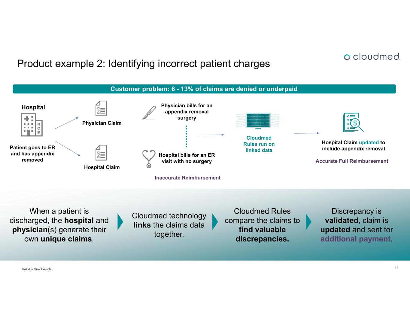 Let me give you one more example of a real challenge for hospital systems identifying incorrect patient charges. We can see that in little green box, it's actually a denials management problem. So the customer problem is, 6% to 13% of all U.S. claims are denied or underpaid. One of the primary reasons they're denied or underpaid is actually a discrepancy in charges. Okay? So on the left, when a patient is discharged in this example, the hospital and physician generate their own unique claims. This is what happens when someone, a patient, goes to the ER and has his or her appendix removed. Two types of claims are filed, a physician claim and a hospital claim. And in this case, you can see the obvious discrepancy. The physician bills for an appendix removal surgery and the hospital bills for an ER visit with no surgery. So there's an inaccurate reimbursement. In this case, the hospital's either underpaid or perhaps a denied claim. Cloudmed sees that same patient, sees the charge, sees across all U.S. states where there are typical discrepancies. This happens to be for appendix, is one of the primary causes of discrepancy. We then link the claims together, run our rules, find the discrepancy, update the hospital claim. So we actually enable the hospital to update their claim that includes appendix removal, validated, updated, and the hospital then sends that claim for additional payment. So these two examples, again, thematically are large scale data problem that is very tough for a hospital to solve on their own, unique IP in our rules or algorithms and data platform, and at the end of the day, we are delivering value to our customers that allow them to succeed.
