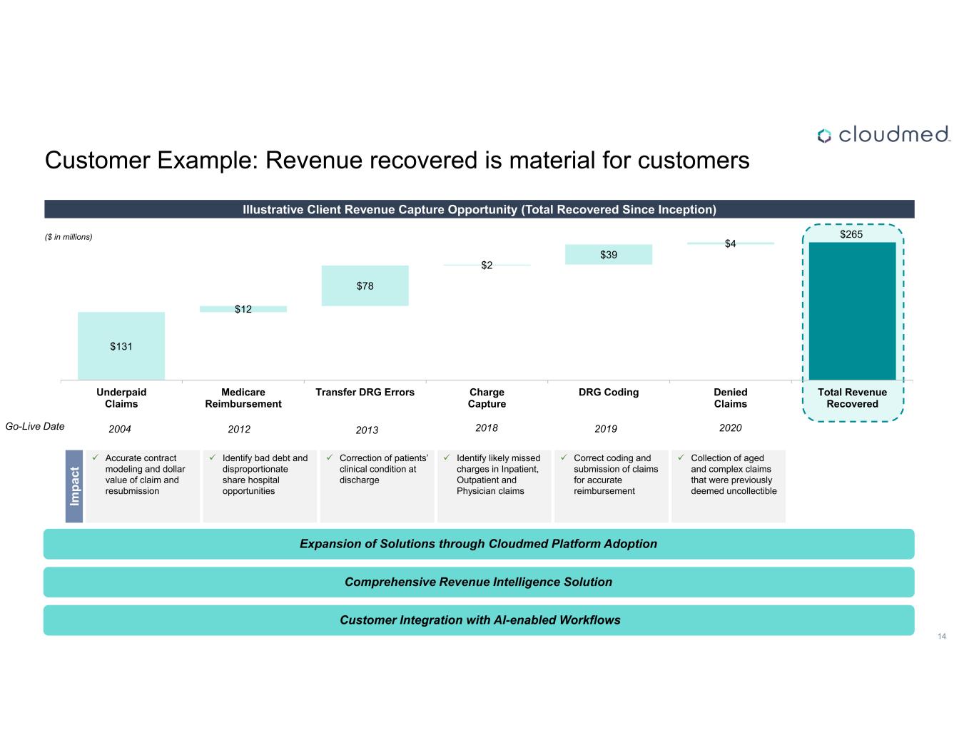 Let me shift gears and talk about value delivered. So here is an example of a customer and numbers for this customer. And what you see here from left to right, are the types of problems mapped to our solutions. Okay? And then you see impact, I won't read through the words, and then higher level impact on the bottom row. From left to right, you see where over time, in this case, it's a long period, 2004 to 2020. We have delivered incremental value to our customers and you see the numbers that lead up to that $265 million. So here are the big takeaways from this slide. One is we are comprehensive across the area of revenue intelligence. We compete with point solutions that operate in one, maybe two of these areas. That's the first point. The second point is we have a very, I haven't talked about this yet, but it'd be very relevant when we talk about the combination with R1, a very strong commercial engine that has had initially a strategy of expanding with our current customers. So remember I talked about 87 of the top 100. That just means we have at least one solution sold. There is a lot of whitespace within our customer base. This is an example of how we've expanded with one customer.