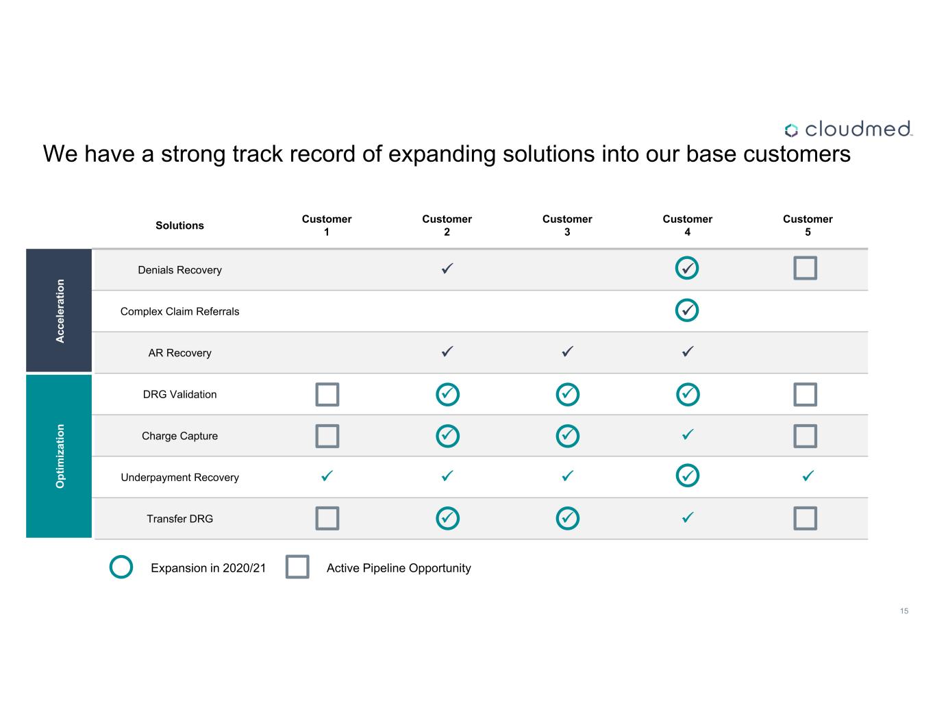 We have a strong track record of expanding solutions into our base customers Solutions Customer 1 Customer 2 Customer 3 Customer 4 Customer 5 A cc el er at io n Denials Recovery Complex Claim Referrals AR Recovery O pt im iz at io n DRG Validation Charge Capture Underpayment Recovery Transfer DRG 15 Expansion in 2020/21 Active Pipeline Opportunity