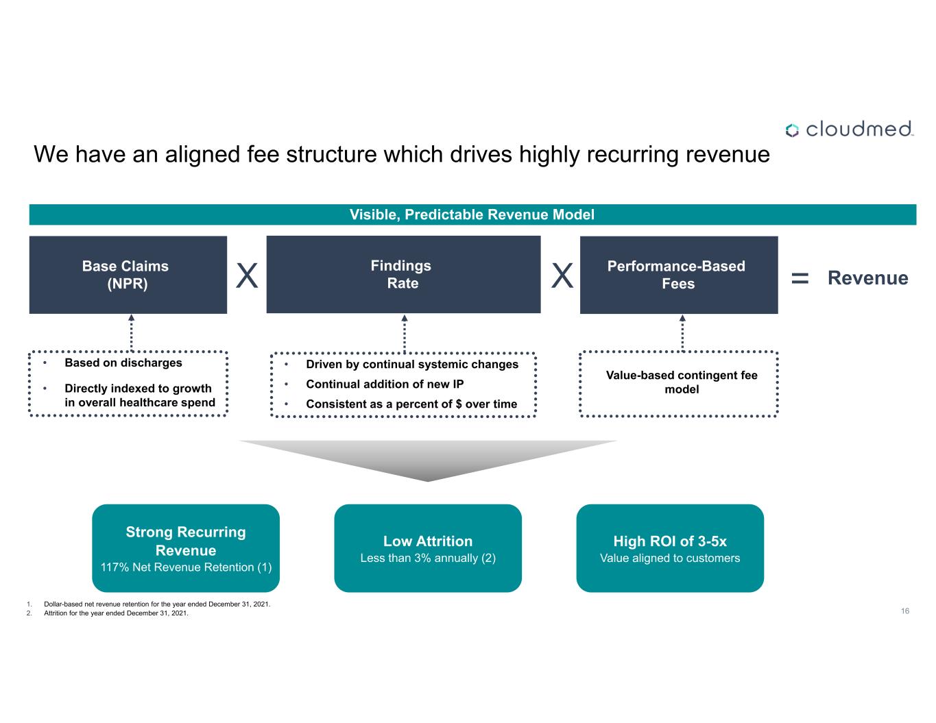 Let me talk through, this is the only slide we have on our aligned fee structure. So let me just walk left to right on how the math works as we think about revenue to Cloudmed, relative to value delivered to a customer. So on the left, let's just pick numbers here. We start with a hospital system will have some level of net patient revenue. So let's pick something on the kind of bottom 50% of U.S. hospital system and say that it's a billion of NPR. Okay? It sounds like a big number. It's not as big on a relative basis for U.S. hospital systems. We believe there's at least 5% of opportunity based on all the reasons I highlighted before, incorrect coding, staff shortages at hospital systems, lack of technology, lack of a true tech platform to solve the problem. That 5% is a $50 million problem. And this is across all areas, so it would map to across all of our solution sets. So if we partnered with this system and sold all of our solutions, and let's just say we charged 20% of the $50 million, revenue to Cloudmed would be $10 million. Okay? So that's the way to think about the math. A couple points I'd make here. This, historically, is highly recurring. We can map our top 10, top 100 customers and see recurring revenues over time. That is in part because a lot of tailwinds increased complexity and regulation, continued patient volumes, inability to solve issues in their system with regard to data, and again, constantly changing regulations that move the ball on these hospital systems when it comes to solving this problem. We have very low attrition, we're very proud of, obviously we would love for attrition to be zero, but very comparable to other high scale growth companies and high ROI to our customers.