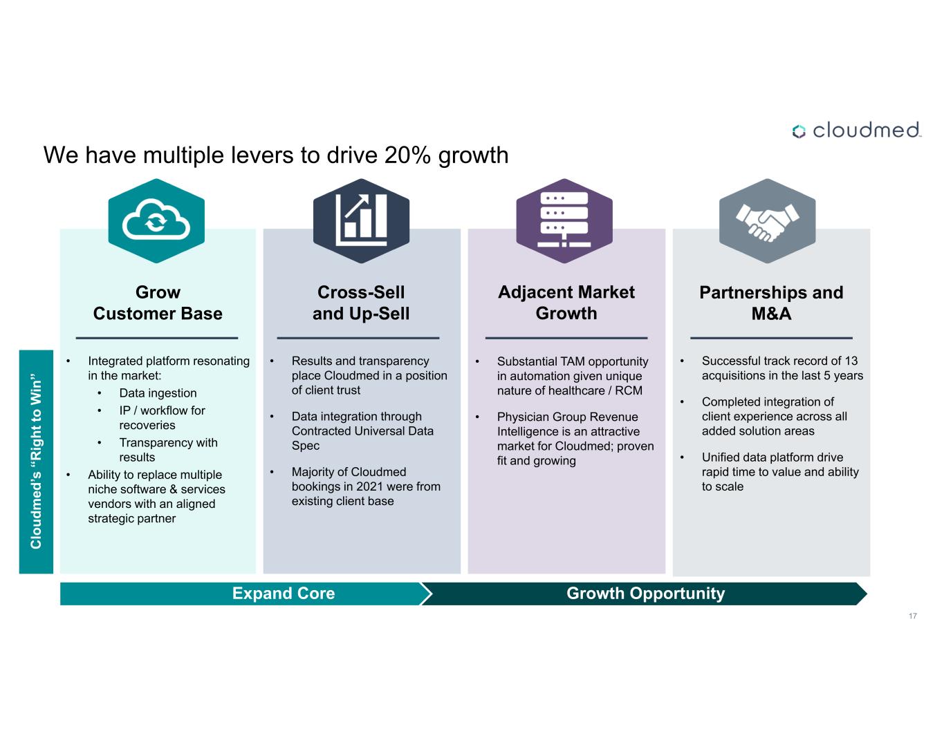 Let me touch on this point. This is the best overview of how we grow. And inevitably you might have questions on this, but let me just touch on this slide. There are really three, call it four levers of how we think about growing Cloudmed. The first is to grow our customer base. I think I've hit that one already. We have 50% of U.S. systems, but lots of opportunity within our customer base. So that's the second point, actually, cross sell and upsell big opportunities within our customer base. That point on the left is, there's still a lot of opportunity to grow outside of our customer base. So 50% of U.S. hospitals do not buy any solution of ours. So we believe that's a huge opportunity. Part of our go-to-market commercial model is tackling both those areas, net new customers, grow the customer base, and cross selling and upsell within our customer base. This third lever is super important and a place where I personally have a lot of experience in my previous roles before Cloudmed, building net new products that in some way, shape or form are adjacent enough and make strategic sense to apply to new adjacent markets. In this case, the most obvious market where we're super under penetrated is the physician group market. So as an example, we believe the underpayments problem is equally large in the physician group market. We have organically built a solution to tackle this problem in that market. And I could give you a host of other examples of innovation around adjacent market growth. Partnerships and M&A, very similar to R1, we are very strategic, very methodical about how we think about M&A. It's not our primary growth lever, but one we think about as strategically, where can we create additive capabilities with M&A and partnership?