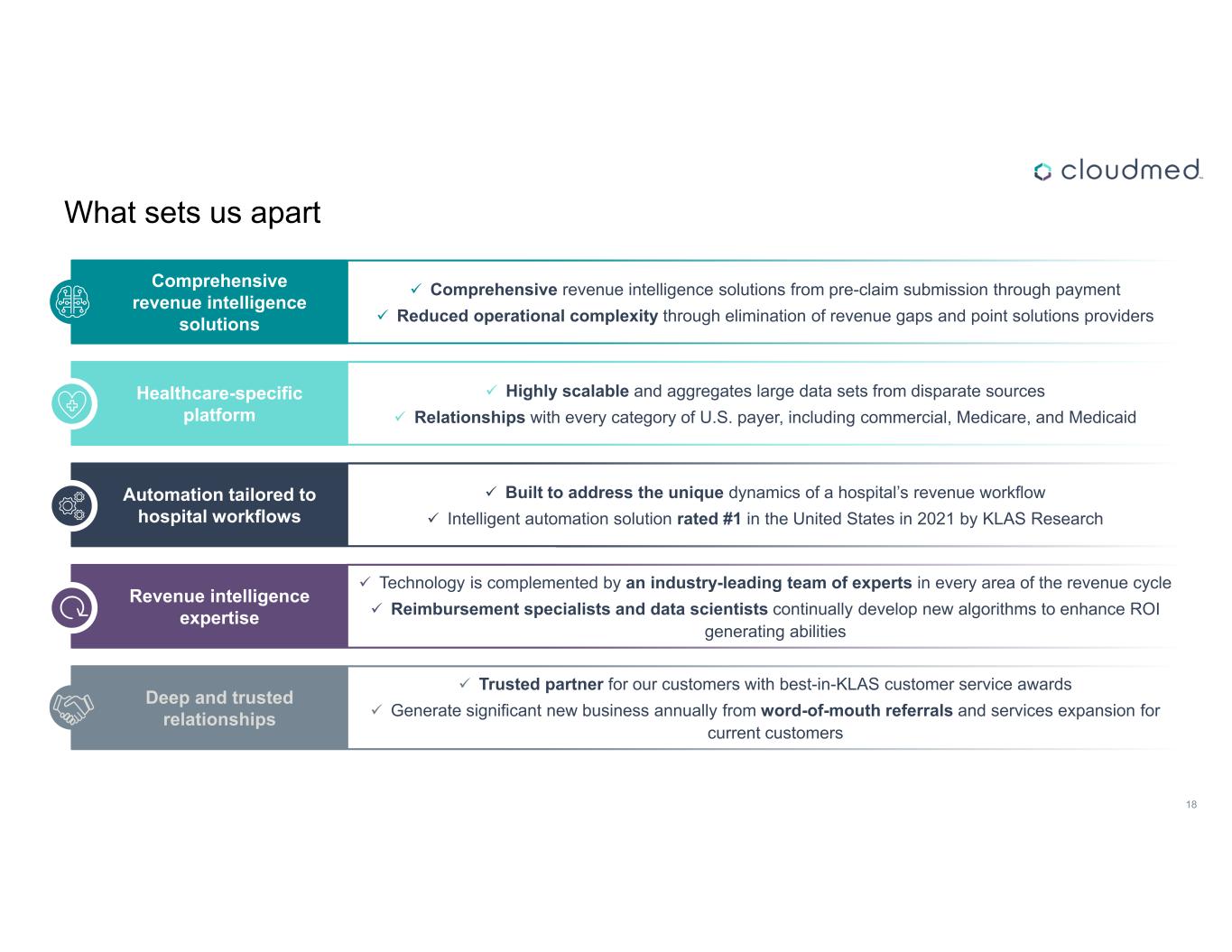 This is a bit of a summary on what sets us apart before I get to some comments on R1. I won't go through this in detail, I've talked to this slide already. The most comprehensive solution competing with either point solutions in the market or hospitals that may for whatever reason do it themselves, a health specific platform with immense automation and analytic capabilities. Automation that is very much tied to hospital workflows. People, staff, real experts we're proud to have as team members. These are revenue intelligence experts, reimbursement specialists, data scientists, different types of team members, and then deep and trusted relationships. You all know that in this industry, in order to be a true trusted partner and have scale, we need to have reference ability. So we're very proud of the work we do for our customers and how referenceable we are as a company.
