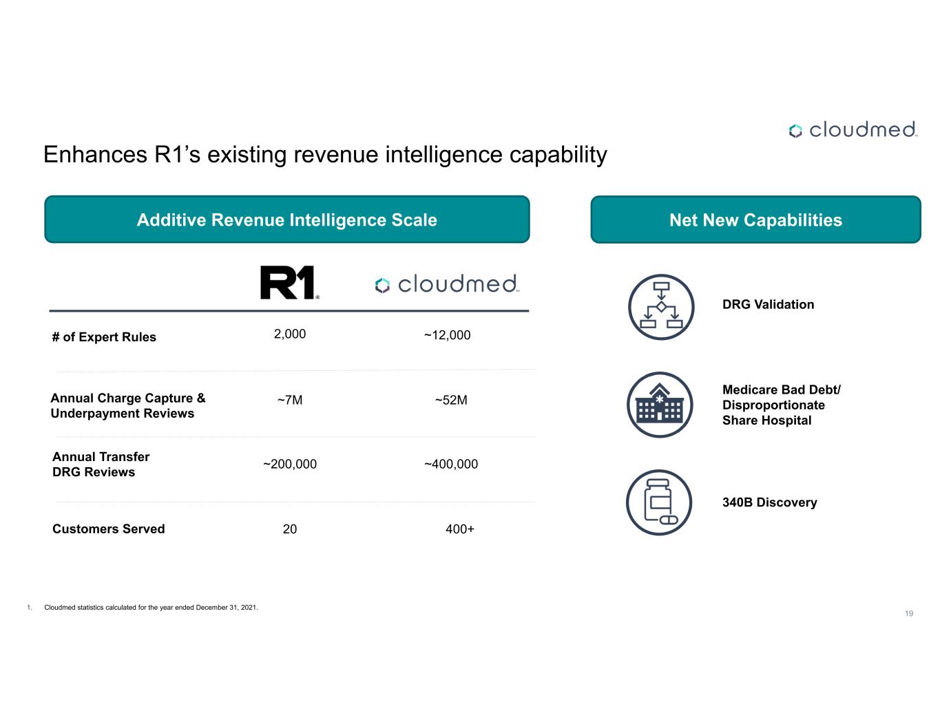 The last two slides talk a bit about our combination with R1. This slide is mostly around revenue intelligence capabilities that are additive. So the themes here are rules, data, and customers. Okay? So you see some numbers on the left side. We bring significant incremental number of algorithms or rules. So this is that knee replacement surgery. If knee replacement in a system is covered by Aetna, in this state, in commercial, there's a likely range of outcomes and range of payments for that setting. We have 12,000 rules that are inference rules that are available in our engine, our platform, if you will, to apply to our solutions. Same thing with annual charges. You see the numbers, R1 on the left, Cloudmed on the right. Same thing with annual transfer DRG reviews, a CMS module around transferring patient from one setting to another, and then one solution sold into our customer base of 400 plus customers. And then you see on the right, several net new capabilities that we would look forward to partnering with R1's base of customers going forward.