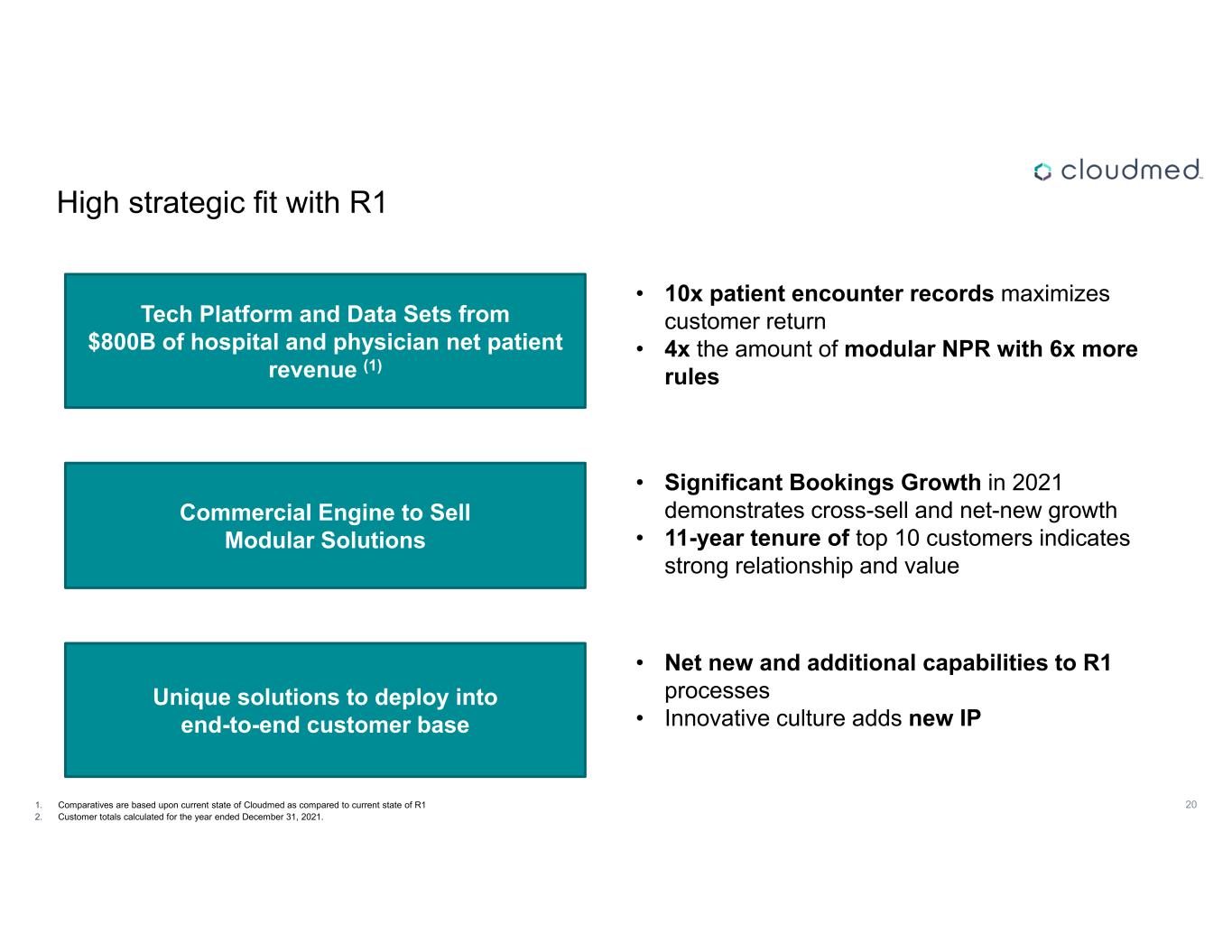 High strategic fit with R1 Tech Platform and Data Sets from $800B of hospital and physician net patient revenue (1) • 10x patient encounter records maximizes customer return • 4x the amount of modular NPR with 6x more rules Commercial Engine to Sell Modular Solutions Unique solutions to deploy into end-to-end customer base • Significant Bookings Growth in 2021 demonstrates cross-sell and net-new growth • 11-year tenure of top 10 customers indicates strong relationship and value • Net new and additional capabilities to R1 processes • Innovative culture adds new IP 201. Comparatives are based upon current state of Cloudmed as compared to current state of R1 2. Customer totals calculated for the year ended December 31, 2021.