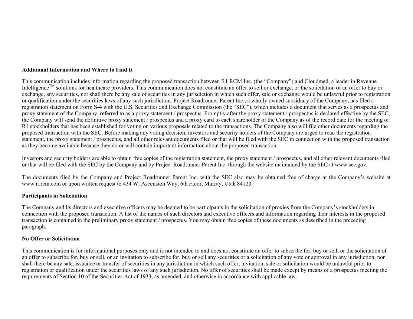 Additional Information and Where to Find It This communication includes information regarding the proposed transaction between R1 RCM Inc. (the “Company”) and Cloudmed, a leader in Revenue IntelligenceTM solutions for healthcare providers. This communication does not constitute an offer to sell or exchange, or the solicitation of an offer to buy or exchange, any securities, nor shall there be any sale of securities in any jurisdiction in which such offer, sale or exchange would be unlawful prior to registration or qualification under the securities laws of any such jurisdiction. Project Roadrunner Parent Inc., a wholly owned subsidiary of the Company, has filed a registration statement on Form S-4 with the U.S. Securities and Exchange Commission (the “SEC”), which includes a document that serves as a prospectus and proxy statement of the Company, referred to as a proxy statement / prospectus. Promptly after the proxy statement / prospectus is declared effective by the SEC, the Company will send the definitive proxy statement / prospectus and a proxy card to each shareholder of the Company as of the record date for the meeting of R1 stockholders that has been established for voting on various proposals related to the transactions. The Company also will file other documents regarding the proposed transaction with the SEC. Before making any voting decision, investors and security holders of the Company are urged to read the registration statement, the proxy statement / prospectus, and all other relevant documents filed or that will be filed with the SEC in connection with the proposed transaction as they become available because they do or will contain important information about the proposed transaction. Investors and security holders are able to obtain free copies of the registration statement, the proxy statement / prospectus, and all other relevant documents filed or that will be filed with the SEC by the Company and by Project Roadrunner Parent Inc. through the website maintained by the SEC at www.sec.gov. The documents filed by the Company and Project Roadrunner Parent Inc. with the SEC also may be obtained free of charge at the Company’s website at www.r1rcm.com or upon written request to 434 W. Ascension Way, 6th Floor, Murray, Utah 84123. Participants in Solicitation The Company and its directors and executive officers may be deemed to be participants in the solicitation of proxies from the Company’s stockholders in connection with the proposed transaction. A list of the names of such directors and executive officers and information regarding their interests in the proposed transaction is contained in the preliminary proxy statement / prospectus. You may obtain free copies of these documents as described in the preceding paragraph. No Offer or Solicitation This communication is for informational purposes only and is not intended to and does not constitute an offer to subscribe for, buy or sell, or the solicitation of an offer to subscribe for, buy or sell, or an invitation to subscribe for, buy or sell any securities or a solicitation of any vote or approval in any jurisdiction, nor shall there be any sale, issuance or transfer of securities in any jurisdiction in which such offer, invitation, sale or solicitation would be unlawful prior to registration or qualification under the securities laws of any such jurisdiction. No offer of securities shall be made except by means of a prospectus meeting the requirements of Section 10 of the Securities Act of 1933, as amended, and otherwise in accordance with applicable law.