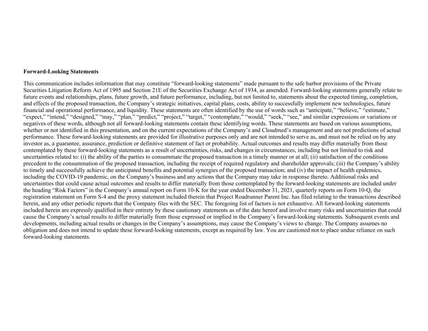 Forward-Looking Statements This communication includes information that may constitute “forward-looking statements” made pursuant to the safe harbor provisions of the Private Securities Litigation Reform Act of 1995 and Section 21E of the Securities Exchange Act of 1934, as amended. Forward-looking statements generally relate to future events and relationships, plans, future growth, and future performance, including, but not limited to, statements about the expected timing, completion, and effects of the proposed transaction, the Company’s strategic initiatives, capital plans, costs, ability to successfully implement new technologies, future financial and operational performance, and liquidity. These statements are often identified by the use of words such as “anticipate,” “believe,” “estimate,” “expect,” “intend,” “designed,” “may,” “plan,” “predict,” “project,” “target,” “contemplate,” “would,” “seek,” “see,” and similar expressions or variations or negatives of these words, although not all forward-looking statements contain these identifying words. These statements are based on various assumptions, whether or not identified in this presentation, and on the current expectations of the Company’s and Cloudmed’s management and are not predictions of actual performance. These forward-looking statements are provided for illustrative purposes only and are not intended to serve as, and must not be relied on by any investor as, a guarantee, assurance, prediction or definitive statement of fact or probability. Actual outcomes and results may differ materially from those contemplated by these forward-looking statements as a result of uncertainties, risks, and changes in circumstances, including but not limited to risk and uncertainties related to: (i) the ability of the parties to consummate the proposed transaction in a timely manner or at all; (ii) satisfaction of the conditions precedent to the consummation of the proposed transaction, including the receipt of required regulatory and shareholder approvals; (iii) the Company’s ability to timely and successfully achieve the anticipated benefits and potential synergies of the proposed transaction; and (iv) the impact of health epidemics, including the COVID-19 pandemic, on the Company’s business and any actions that the Company may take in response thereto. Additional risks and uncertainties that could cause actual outcomes and results to differ materially from those contemplated by the forward-looking statements are included under the heading “Risk Factors” in the Company’s annual report on Form 10-K for the year ended December 31, 2021, quarterly reports on Form 10-Q, the registration statement on Form S-4 and the proxy statement included therein that Project Roadrunner Parent Inc. has filed relating to the transactions described herein, and any other periodic reports that the Company files with the SEC. The foregoing list of factors is not exhaustive. All forward-looking statements included herein are expressly qualified in their entirety by these cautionary statements as of the date hereof and involve many risks and uncertainties that could cause the Company’s actual results to differ materially from those expressed or implied in the Company’s forward-looking statements. Subsequent events and developments, including actual results or changes in the Company’s assumptions, may cause the Company’s views to change. The Company assumes no obligation and does not intend to update these forward-looking statements, except as required by law. You are cautioned not to place undue reliance on such forward-looking statements.