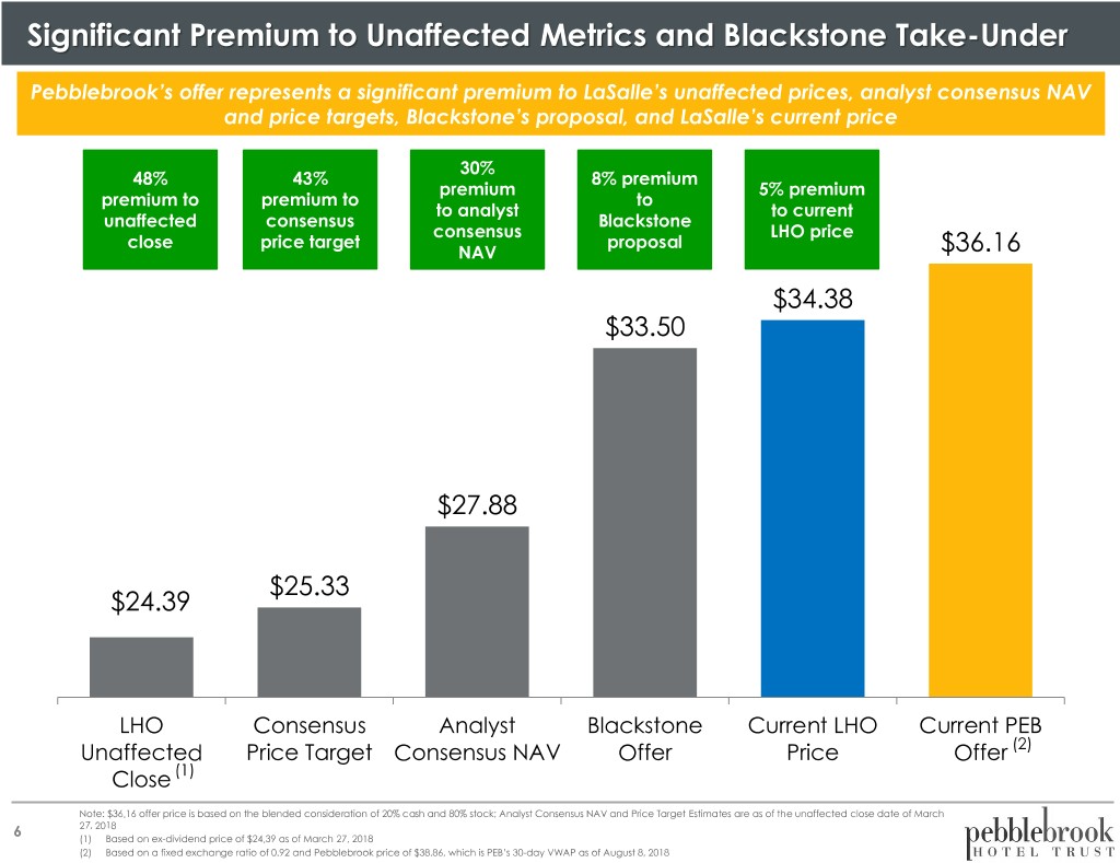 Significant Premium to Unaffected Metrics and Blackstone Take-Under Pebblebrook’s offer represents a significant premium to LaSalle’s unaffected prices, analyst consensus NAV and price targets, Blackstone’s proposal, and LaSalle’s current price 30% 48% 43% 8% premium premium 5% premium premium to premium to to to analyst to current unaffected consensus Blackstone consensus LHO price close price target proposal NAV $36.16 $34.38 $33.50 $27.88 $25.33 $24.39 LHO Consensus Analyst Blackstone Current LHO Current PEB Unaffected Price Target Consensus NAV Offer Price Offer (2) Close (1) Note: $36.16 offer price is based on the blended consideration of 20% cash and 80% stock; Analyst Consensus NAV and Price Target Estimates are as of the unaffected close date of March 6 27, 2018 (1) Based on ex-dividend price of $24.39 as of March 27, 2018 (2) Based on a fixed exchange ratio of 0.92 and Pebblebrook price of $38.86, which is PEB’s 30-day VWAP as of August 8, 2018