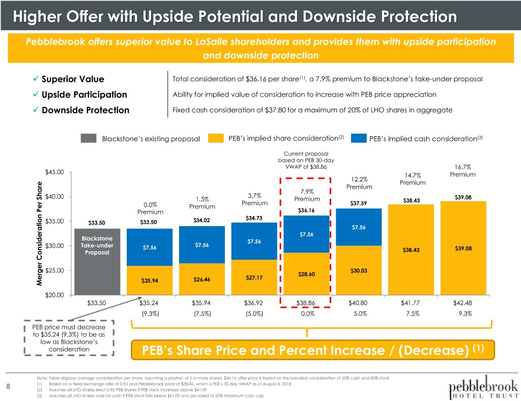 Pebblebrook Offers Materially Higher Consideration LaSalle Board could give $300-$400 million more in value to shareholders instead of to Blackstone (1) $36.16 7.9% higher consideration goes to $33.50 LaSalle shareholders instead of Blackstone Current Blackstone Pebblebrook Take-under Proposal Offer We are not aware of any listed equity REIT M&A transaction since 2006 in which a target has agreed to a cash proposal at a discount of greater than 1% compared to a competing share or share and cash proposal(2) Note: $36.16 offer price is based on the blended consideration of 20% cash and 80% stock 7 (1) Based on a fixed exchange ratio of 0.92 and Pebblebrook price of $38.86, which is PEB’s 30-day VWAP as of August 8, 2018 (2) The only listed equity REIT M&A transaction since 2006 in which a lower cash proposal was accepted compared to a competing share or share and cash proposal was Blackstone’s acquisition of Equity Office Properties in 2007; Blackstone’s proposal represented a less than 1% discount to the competing stock/cash proposal