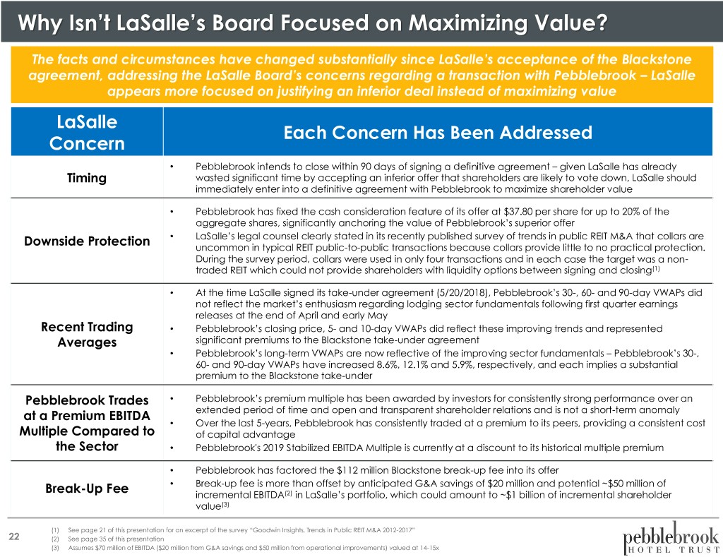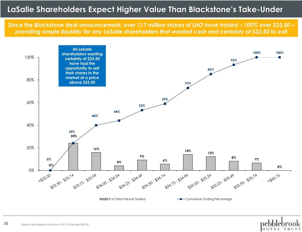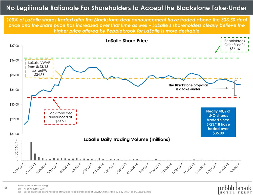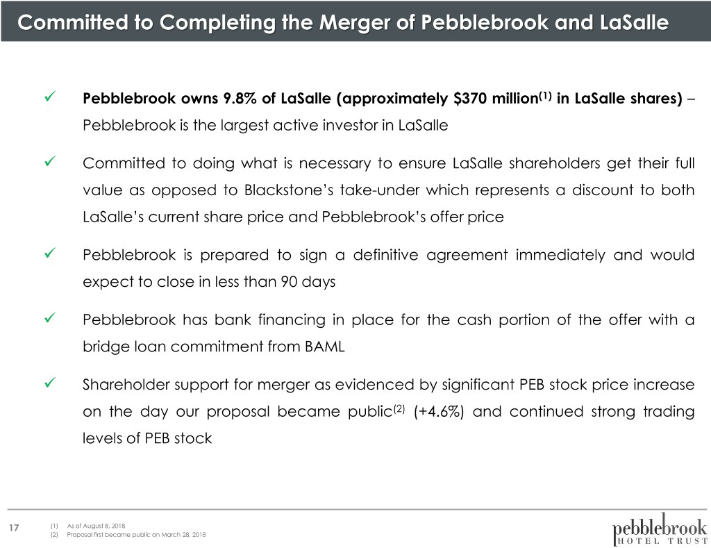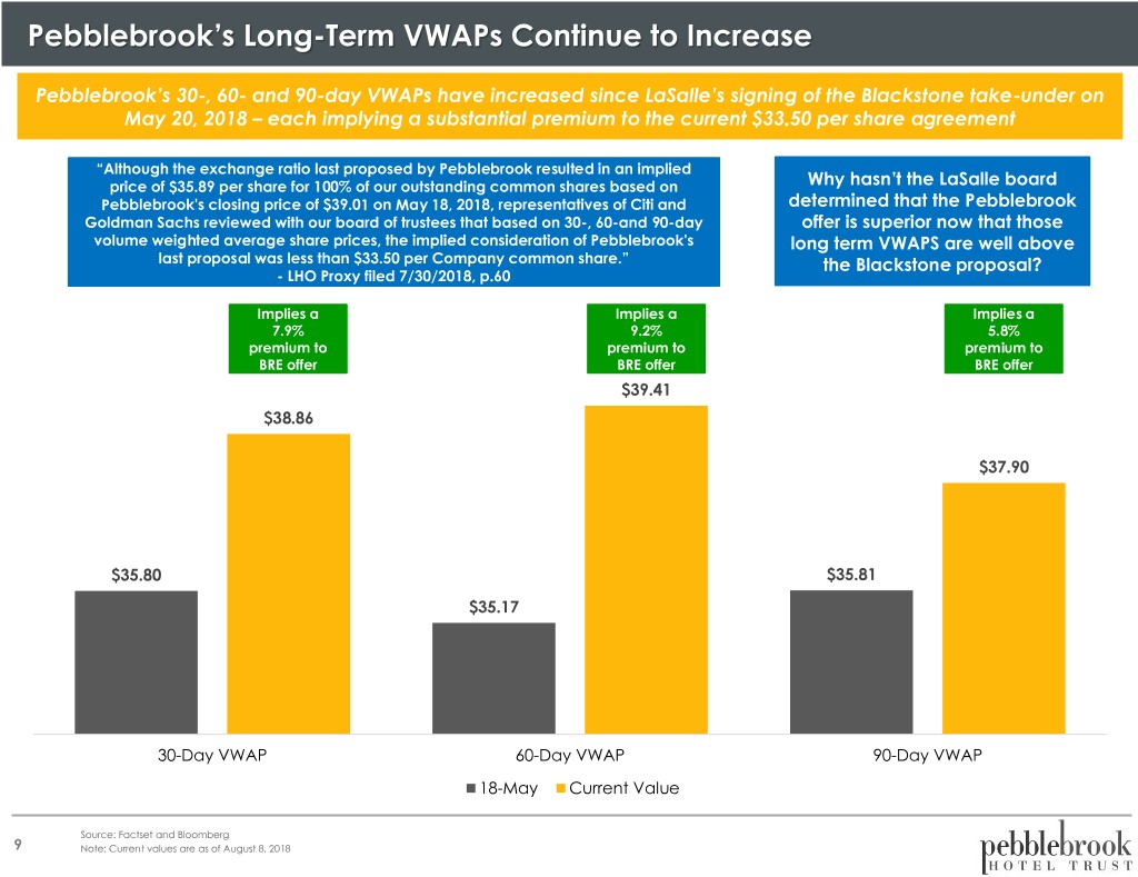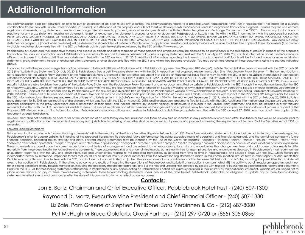 Additional Information This communication does not constitute an offer to buy or solicitation of an offer to sell any securities. This communication relates to a proposal which Pebblebrook Hotel Trust (“Pebblebrook”) has made for a business combination transaction with LaSalle Hotel Properties (“LaSalle”). In furtherance of this proposal and subject to future developments, Pebblebrook (and, if a negotiated transaction is agreed, LaSalle) may file one or more registration statements, proxy statements, tender or exchange offer statements, prospectuses or other documents with the United States Securities and Exchange Commission (the “SEC”). This communication is not a substitute for any proxy statement, registration statement, tender or exchange offer statement, prospectus or other document Pebblebrook or LaSalle may file with the SEC in connection with the proposed transaction. INVESTORS AND SECURITY HOLDERS OF PEBBLEBROOK AND LASALLE ARE URGED TO READ ANY SUCH PROXY STATEMENT, REGISTRATION STATEMENT, TENDER OR EXCHANGE OFFER STATEMENT, PROSPECTUS AND OTHER DOCUMENTS FILED WITH THE SEC CAREFULLY AND IN THEIR ENTIRETY IF AND WHEN THEY BECOME AVAILABLE AS THEY WILL CONTAIN IMPORTANT INFORMATION ABOUT THE PROPOSED TRANSACTION. Any definitive proxy statement or prospectus (if and when available) will be delivered to shareholders of LaSalle or Pebblebrook, as applicable. Investors and security holders will be able to obtain free copies of these documents (if and when available) and other documents filed with the SEC by Pebblebrook through the website maintained by the SEC at http://www.sec.gov. Pebblebrook or LaSalle and their respective trustees and executive officers and other members of management and employees may be deemed to be participants in the solicitation of proxies in respect of the proposed transaction. You can find information about Pebblebrook’s executive officers and trustees in Pebblebrook’s definitive proxy statement filed with the SEC on April 27, 2018. You can find information about LaSalle’s executive officers and trustees in LaSalle’s definitive proxy statement filed with the SEC on March 22, 2018. Additional information regarding the interests of such potential participants will be included in one or more registration statements, proxy statements, tender or exchange offer statements or other documents filed with the SEC if and when they become available. You may obtain free copies of these documents using the sources indicated above. In connection with the proposed merger transaction between LaSalle and affiliates of Blackstone, which Pebblebrook opposes (the “Proposed BRE Merger”), LaSalle filed a definitive proxy statement with the SEC on July 30, 2018 (the “LaSalle Proxy Statement”). On July 30, 2018, Pebblebrook filed a definitive proxy statement with the SEC in opposition that proposed merger transaction (the “Pebblebrook Proxy Statement”). This communication is not a substitute for the LaSalle Proxy Statement or the Pebblebrook Proxy Statement or for any other document that LaSalle or Pebblebrook have filed or may file with the SEC or send to LaSalle shareholders in connection with the Proposed BRE Merger. BEFORE MAKING ANY VOTING DECISION, INVESTORS AND SECURITY HOLDERS OF LASALLE ARE URGED TO READ THE LASALLE PROXY STATEMENT, THE PEBBLEBROOK PROXY STATEMENT AND OTHER DOCUMENTS FILED WITH THE SEC CAREFULLY AND IN THEIR ENTIRETY BECAUSE THEY CONTAIN IMPORTANT INFORMATION ABOUT PEBBLEBROOK, LASALLE, THE PROPOSED BRE MERGER AND RELATED MATTERS. Investors and security holders are able to obtain free copies of the LaSalle Proxy Statement, the Pebblebrook Proxy Statement and other documents filed by LaSalle or Pebblebrook with the SEC through the website maintained by the SEC at http://www.sec.gov. Copies of the documents filed by LaSalle with the SEC are also available free of charge on LaSalle’s website at www.lasallehotels.com, or by contacting LaSalle’s Investor Relations Department at (301) 941-1500. Copies of the documents filed by Pebblebrook with the SEC are also available free of charge on Pebblebrook’s website at www.pebblebrookhotels.com, or by contacting Pebblebrook’s Investor Relations at (240) 507-1330. LaSalle and its trustees and certain of its executive officers may be considered participants in the solicitation of proxies from LaSalle’s shareholders with respect to the Proposed BRE Merger under the rules of the SEC. Information about the trustees and executive officers of LaSalle is set forth in LaSalle’s Annual Report on Form 10-K for the year ended December 31, 2017, which was filed with the SEC on February 20, 2018, LaSalle’s proxy statement for its 2018 annual meeting of shareholders, which was filed with the SEC on March 22, 2018, and in subsequent documents filed by LaSalle with the SEC. Additional information regarding persons who may be deemed participants in the proxy solicitations and a description of their direct and indirect interests, by security holdings or otherwise, is included in the LaSalle Proxy Statement and may be included in other relevant materials to be filed with the SEC. Pebblebrook and its trustees and executive officers and other members of management and employees may be deemed to be participants in the solicitation of proxies in respect of the Proposed BRE Merger. You can find information about Pebblebrook’s executive officers and trustees in Pebblebrook’s definitive proxy statement filed with the SEC on April 27, 2018. You may obtain free copies of this document as described above. This document shall not constitute an offer to sell or the solicitation of an offer to buy any securities, nor shall there be any sale of securities in any jurisdiction in which such offer, solicitation or sale would be unlawful prior to registration or qualification under the securities laws of any such jurisdiction. No offering of securities shall be made except by means of a prospectus meeting