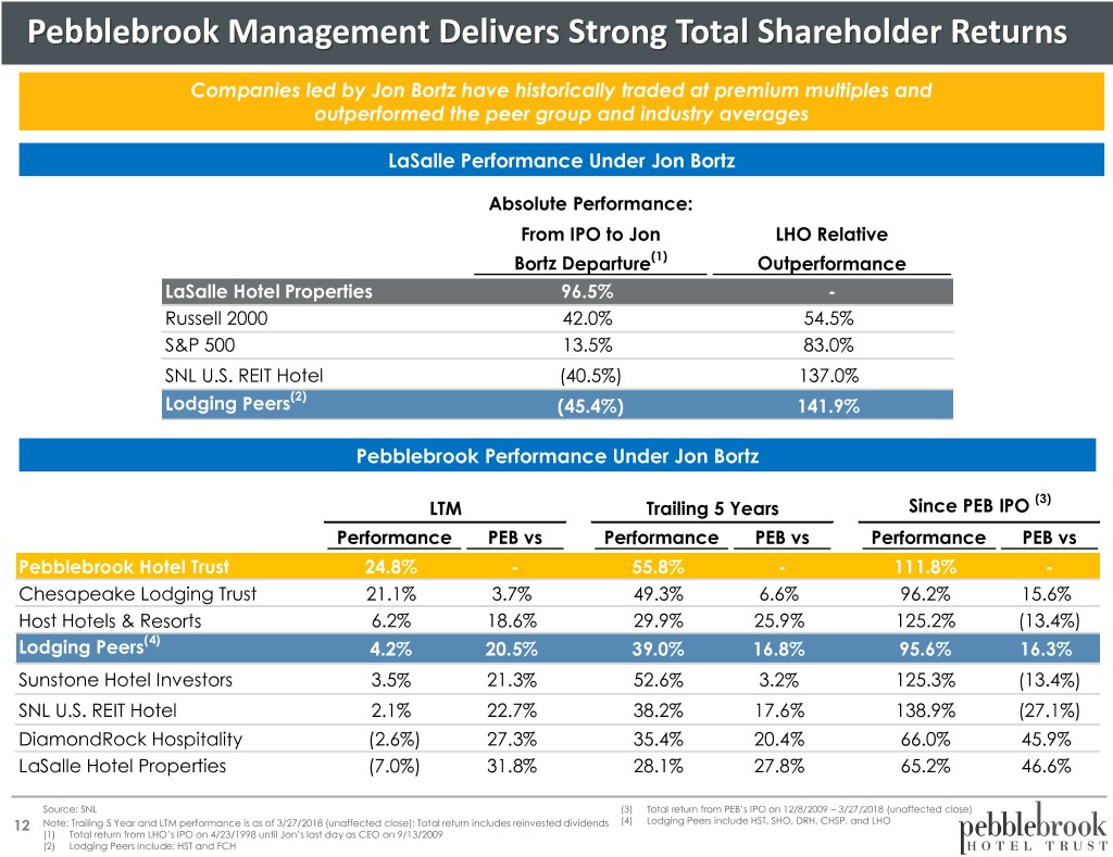Upside Potential for LaSalle Shareholders Pebblebrook’s offer provides LaSalle shareholders with significant long-term upside potential . Pebblebrook is led by a proven management team with deep industry experience, a stellar reputation among the shareholder community, and personal knowledge of many of LaSalle’s assets. Under the leadership of Jon Bortz, the former Chairman and CEO of LaSalle, Pebblebrook has generated industry-leading returns since its inception, outperforming LaSalle by 47%(1) . Pebblebrook and LaSalle have tremendous similarities including property quality, geography, markets, operators and brands . Combination would create clear industry leader of high-quality independent and branded hotels that would greatly benefit shareholders of both companies . Meaningful opportunity to create shareholder value via synergies and improvement of LaSalle hotel EBITDA by Pebblebrook management . LaSalle shareholders also benefit from Pebblebrook’s accelerated growth outlook in 2019 . Strong shareholder and analyst support for Pebblebrook and LaSalle strategic combination is an affirmation of the long-term potential, further evidenced by the many letters from institutional LaSalle shareholders sent to LaSalle’s Board in support of Pebblebrook’s offer and consistent trading above Blackstone $33.50 per share take-under agreement (1) Total return from PEB’s IPO on 12/8/2009 – 3/27/2018 (unaffected close) 11