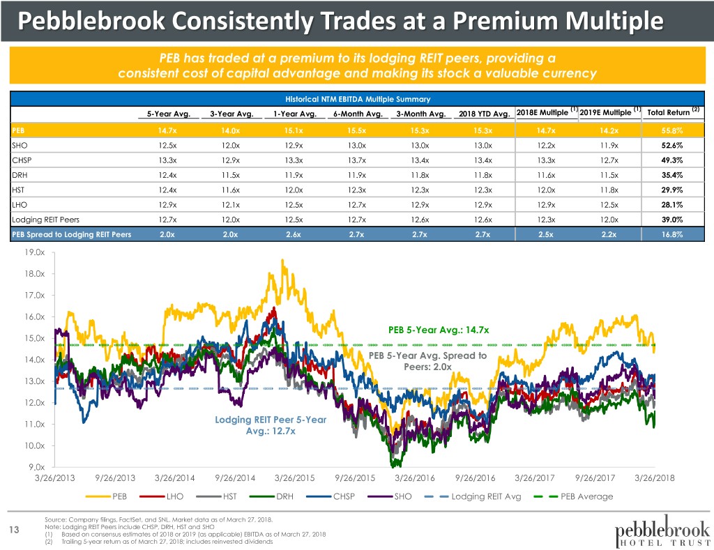 Pebblebrook Management Delivers Strong Total Shareholder Returns Companies led by Jon Bortz have historically traded at premium multiples and outperformed the peer group and industry averages LaSalle Performance Under Jon Bortz Absolute Performance: From IPO to Jon LHO Relative Bortz Departure(1) Outperformance LaSalle Hotel Properties 96.5% - Russell 2000 42.0% 54.5% S&P 500 13.5% 83.0% SNL U.S. REIT Hotel (40.5%) 137.0% (2) Lodging Peers (45.4%) 141.9% Pebblebrook Performance Under Jon Bortz (3) LTM Trailing 5 Years Since PEB IPO Performance PEB vs Performance PEB vs Performance PEB vs Pebblebrook Hotel Trust 24.8% - 55.8% - 111.8% - Chesapeake Lodging Trust 21.1% 3.7% 49.3% 6.6% 96.2% 15.6% Host Hotels & Resorts 6.2% 18.6% 29.9% 25.9% 125.2% (13.4%) (4) Lodging Peers 4.2% 20.5% 39.0% 16.8% 95.6% 16.3% Sunstone Hotel Investors 3.5% 21.3% 52.6% 3.2% 125.3% (13.4%) SNL U.S. REIT Hotel 2.1% 22.7% 38.2% 17.6% 138.9% (27.1%) DiamondRock Hospitality (2.6%) 27.3% 35.4% 20.4% 66.0% 45.9% LaSalle Hotel Properties (7.0%) 31.8% 28.1% 27.8% 65.2% 46.6% Source: SNL (3) Total return from PEB’s IPO on 12/8/2009 – 3/27/2018 (unaffected close) 12 Note: Trailing 5 Year and LTM performance is as of 3/27/2018 (unaffected close); Total return includes reinvested dividends (4) Lodging Peers include HST, SHO, DRH, CHSP, and LHO (1) Total return from LHO’s IPO on 4/23/1998 until Jon’s last day as CEO on 9/13/2009 (2) Lodging Peers include: HST and FCH