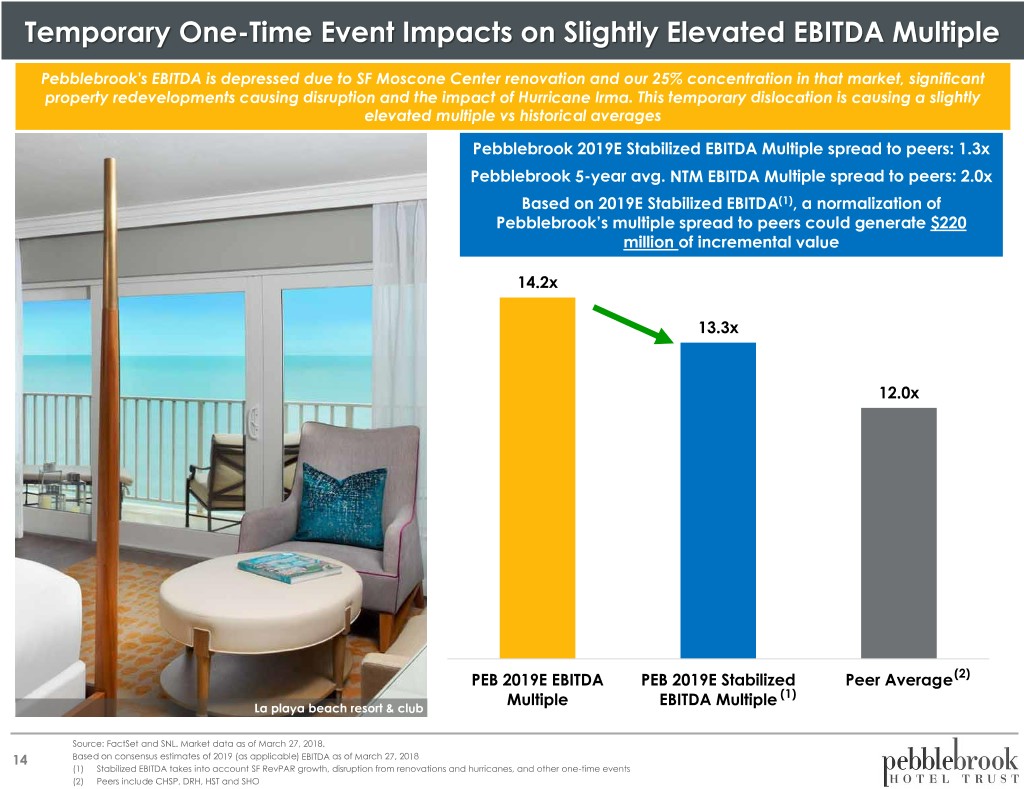 Pebblebrook Consistently Trades at a Premium Multiple PEB has traded at a premium to its lodging REIT peers, providing a consistent cost of capital advantage and making its stock a valuable currency Historical NTM EBITDA Multiple Summary (1) (1) (2) 5-Year Avg. 3-Year Avg. 1-Year Avg. 6-Month Avg. 3-Month Avg. 2018 YTD Avg. 2018E Multiple 2019E Multiple Total Return PEB 14.7x 14.0x 15.1x 15.5x 15.3x 15.3x 14.7x 14.2x 55.8% SHO 12.5x 12.0x 12.9x 13.0x 13.0x 13.0x 12.2x 11.9x 52.6% CHSP 13.3x 12.9x 13.3x 13.7x 13.4x 13.4x 13.3x 12.7x 49.3% DRH 12.4x 11.5x 11.9x 11.9x 11.8x 11.8x 11.6x 11.5x 35.4% HST 12.4x 11.6x 12.0x 12.3x 12.3x 12.3x 12.0x 11.8x 29.9% LHO 12.9x 12.1x 12.5x 12.7x 12.9x 12.9x 12.9x 12.5x 28.1% Lodging REIT Peers 12.7x 12.0x 12.5x 12.7x 12.6x 12.6x 12.3x 12.0x 39.0% PEB Spread to Lodging REIT Peers 2.0x 2.0x 2.6x 2.7x 2.7x 2.7x 2.5x 2.2x 16.8% 19.0x 18.0x 17.0x 16.0x PEB 5-Year Avg.: 14.7x 15.0x 14.0x PEB 5-Year Avg. Spread to Peers: 2.0x 13.0x 12.0x 11.0x Lodging REIT Peer 5-Year Avg.: 12.7x 10.0x 9.0x 3/26/2013 9/26/2013 3/26/2014 9/26/2014 3/26/2015 9/26/2015 3/26/2016 9/26/2016 3/26/2017 9/26/2017 3/26/2018 PEB LHO HST DRH CHSP SHO Lodging REIT Avg PEB Average Source: Company filings, FactSet, and SNL. Market data as of March 27, 2018. Note: Lodging REIT Peers include CHSP, DRH, HST and SHO 13 (1) Based on consensus estimates of 2018 or 2019 (as applicable) EBITDA as of March 27, 2018 (2) Trailing 5-year return as of March 27, 2018; includes reinvested dividends