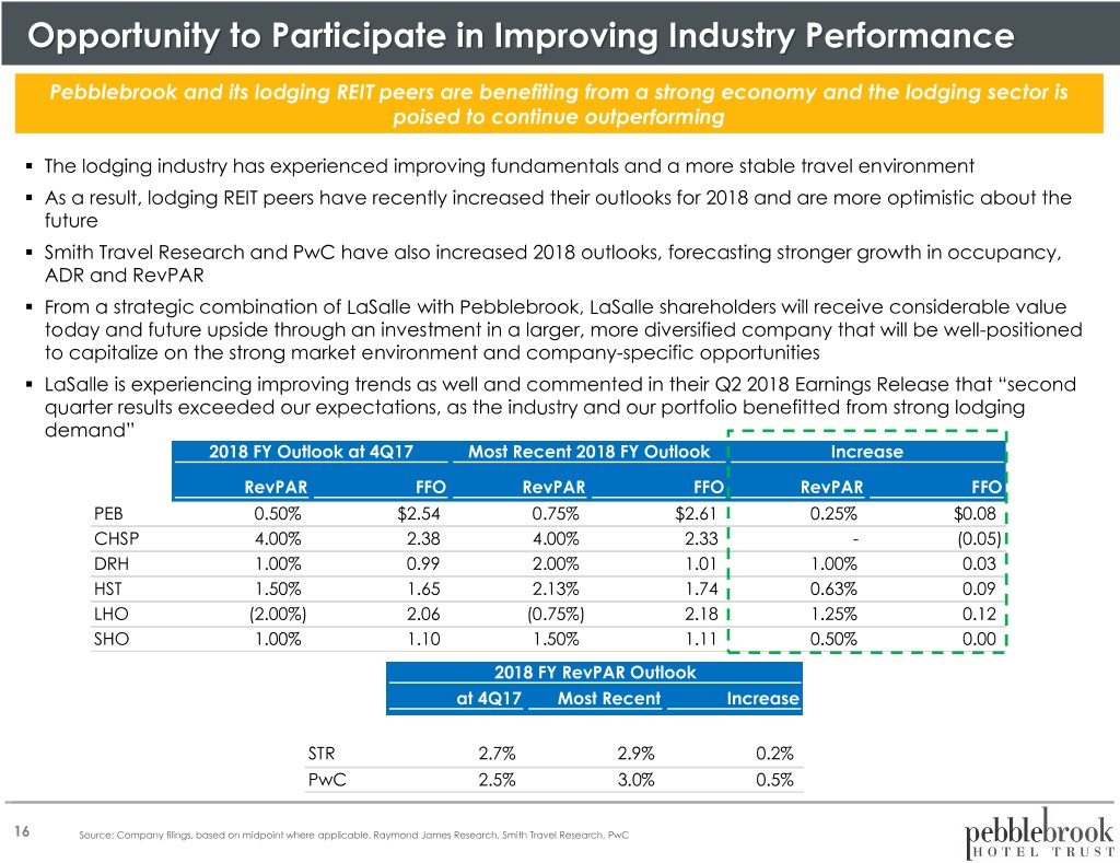 Compelling Opportunity to Create Shareholder Value . Create the premier, best-in-class lodging REIT portfolio . 69 primarily upper-upscale and luxury independent and branded hotels and resorts . Located in or near the key urban markets in the United States . Well-diversified by brand and management company, including a significant number of unique market-leading independent and branded hotels . Significant exposure to major west coast cities with strong long-term growth and high barriers-to-entry . Create the clear industry leader with benefits from additional scale . Third largest lodging REIT by enterprise value and the largest owner of independent / lifestyle hotels . Enhanced liquidity for shareholders as a result of the larger shareholder base and increased equity market capitalization . Fresh and proven asset management approach and strategies on LaSalle assets . Opportunity to improve EBITDA per key for LaSalle’s hotels to in-line with Pebblebrook’s EBITDA per key . Pebblebrook’s 2018E EBITDA per key is ~$5k higher than LaSalle’s (~$2.5K in 2017 and ~$4.0k in 2016) . Closing the EBITDA per key gap on LaSalle’s 10,452 keys would create significant EBITDA enhancement . Similarities in assets and management strategies create significant opportunities for synergies . Increased influence and negotiating strength with management companies and brands . Clustered assets and properties operated by common management companies in select markets create revenue enhancement opportunities and reduced expenses from synergies . Combined portfolio to benefit from best practices from both companies . Stronger financial profile and higher dividend with lower cost of capital . Strong balance sheet with increased flexibility and access to capital markets . Robust cash flow with increased and more stable and higher dividend to LaSalle shareholders . Potential for lower cost debt and preferred equity, with clear path to public investment grade debt opportunities . Strong widespread support from investment community . Proposed combination has significant support from research community and shareholder base of each company . Potential for higher implied EBITDA multiple post-merger, providing the combined company with a competitive advantage for future acquisitions 15