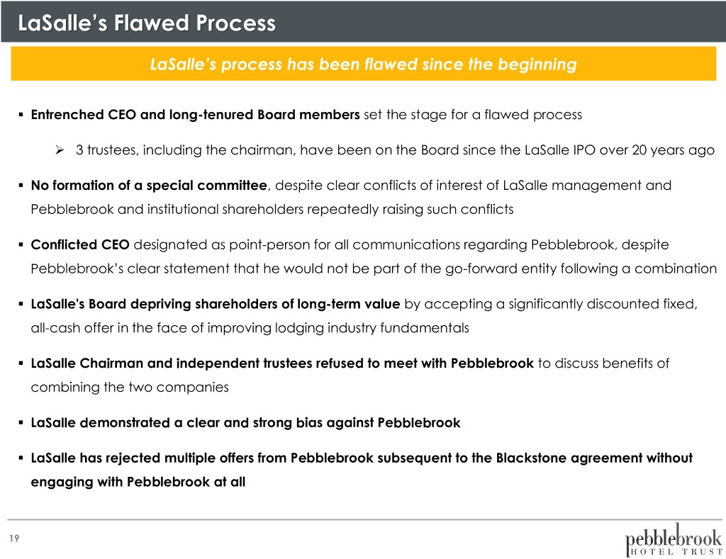 LaSalle’s Flawed Process LaSalle’s process has been flawed since the beginning . Entrenched CEO and long-tenured Board members set the stage for a flawed process 3 trustees, including the chairman, have been on the Board since the LaSalle IPO over 20 years ago . No formation of a special committee, despite clear conflicts of interest of LaSalle management and Pebblebrook and institutional shareholders repeatedly raising such conflicts . Conflicted CEO designated as point-person for all communications regarding Pebblebrook, despite Pebblebrook’s clear statement that he would not be part of the go-forward entity following a combination . LaSalle's Board depriving shareholders of long-term value by accepting a significantly discounted fixed, all-cash offer in the face of improving lodging industry fundamentals . LaSalle Chairman and independent trustees refused to meet with Pebblebrook to discuss benefits of combining the two companies . LaSalle demonstrated a clear and strong bias against Pebblebrook . LaSalle has rejected multiple offers from Pebblebrook subsequent to the Blackstone agreement without engaging with Pebblebrook at all 19