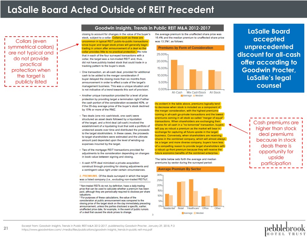 LaSalle Board Acted Outside of REIT Precedent Goodwin Insights, Trends in Public REIT M&A 2012-2017 LaSalle Board Collars (even accepted symmetrical collars) unprecedented are not typical and discount for all-cash do not provide practical offer according to protection when Goodwin Procter, the target is LaSalle’s legal publicly listed counsel Cash premiums are higher than stock deal premiums because in stock deals there is opportunity for upside participation Excerpt from: Goodwin Insights, Trends in Public REIT M&A 2012-2017, published by Goodwin Procter, January 29, 2018, P.3 21 https://www.goodwinlaw.com/-/media/files/publications/goodwin-insights_trends-in-public-reit-ma.pdf