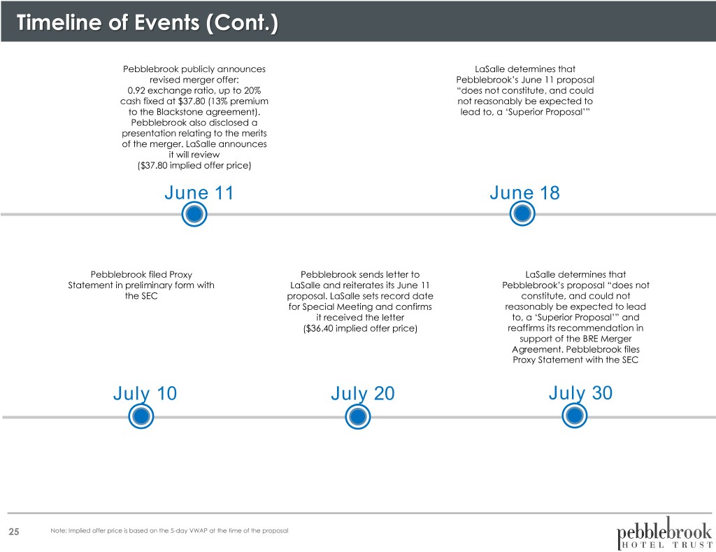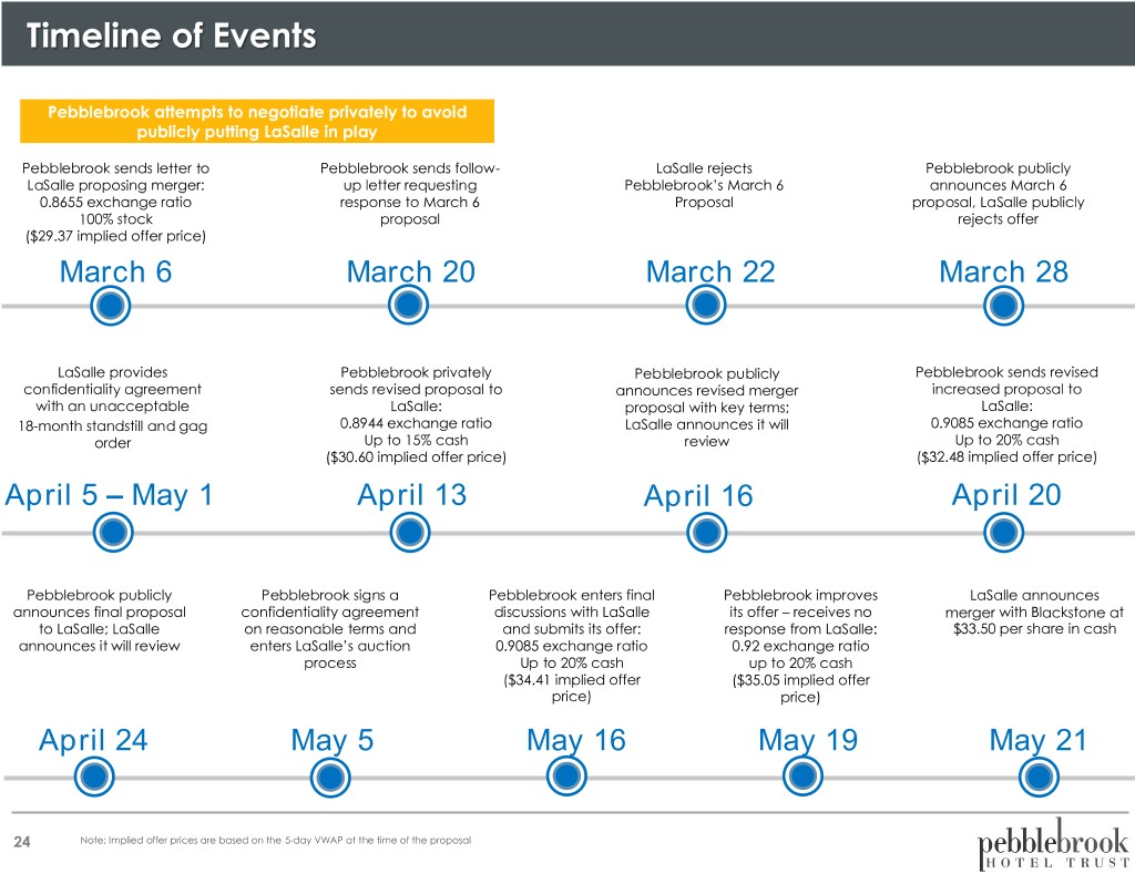 Timeline of Events Pebblebrook attempts to negotiate privately to avoid publicly putting LaSalle in play Pebblebrook sends letter to Pebblebrook sends follow- LaSalle rejects Pebblebrook publicly LaSalle proposing merger: up letter requesting Pebblebrook’s March 6 announces March 6 0.8655 exchange ratio response to March 6 Proposal proposal, LaSalle publicly 100% stock proposal rejects offer ($29.37 implied offer price) March 6 March 20 March 22 March 28 LaSalle provides Pebblebrook privately Pebblebrook publicly Pebblebrook sends revised confidentiality agreement sends revised proposal to announces revised merger increased proposal to with an unacceptable LaSalle: proposal with key terms; LaSalle: 18-month standstill and gag 0.8944 exchange ratio LaSalle announces it will 0.9085 exchange ratio order Up to 15% cash review Up to 20% cash ($30.60 implied offer price) ($32.48 implied offer price) April 5 – May 1 April 13 April 16 April 20 Pebblebrook publicly Pebblebrook signs a Pebblebrook enters final Pebblebrook improves LaSalle announces announces final proposal confidentiality agreement discussions with LaSalle its offer – receives no merger with Blackstone at to LaSalle; LaSalle on reasonable terms and and submits its offer: response from LaSalle: $33.50 per share in cash announces it will review enters LaSalle’s auction 0.9085 exchange ratio 0.92 exchange ratio process Up to 20% cash up to 20% cash ($34.41 implied offer ($35.05 implied offer price) price) April 24 May 5 May 16 May 19 May 21 24 Note: Implied offer prices are based on the 5-day VWAP at the time of the proposal