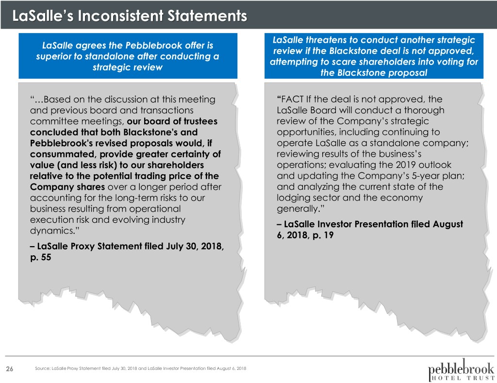 Timeline of Events (Cont.) Pebblebrook publicly announces LaSalle determines that revised merger offer: Pebblebrook’s June 11 proposal 0.92 exchange ratio, up to 20% “does not constitute, and could cash fixed at $37.80 (13% premium not reasonably be expected to to the Blackstone agreement). lead to, a ‘Superior Proposal’” Pebblebrook also disclosed a presentation relating to the merits of the merger. LaSalle announces it will review ($37.80 implied offer price) June 11 June 18 Pebblebrook filed Proxy Pebblebrook sends letter to LaSalle determines that Statement in preliminary form with LaSalle and reiterates its June 11 Pebblebrook’s proposal “does not the SEC proposal. LaSalle sets record date constitute, and could not for Special Meeting and confirms reasonably be expected to lead it received the letter to, a ‘Superior Proposal’” and ($36.40 implied offer price) reaffirms its recommendation in support of the BRE Merger Agreement. Pebblebrook files Proxy Statement with the SEC July 10 July 20 July 30 25 Note: Implied offer price is based on the 5-day VWAP at the time of the proposal