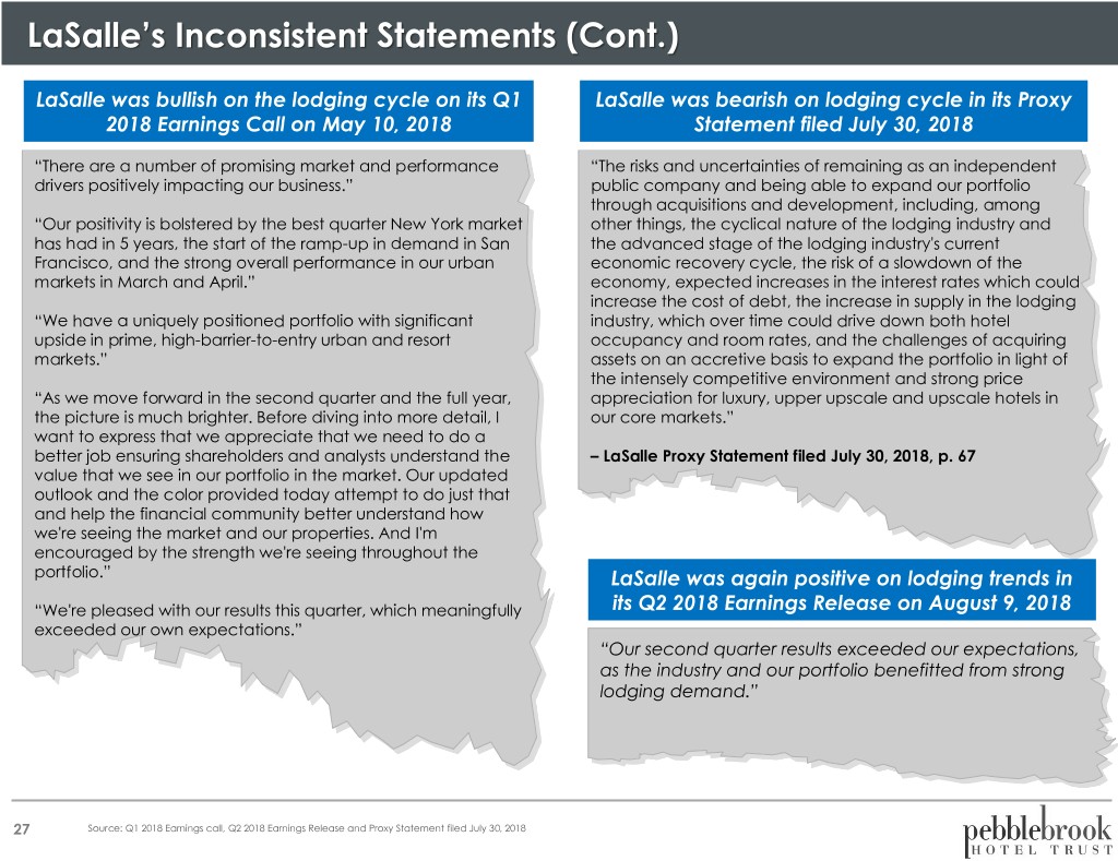 LaSalle’s Inconsistent Statements LaSalle threatens to conduct another strategic LaSalle agrees the Pebblebrook offer is review if the Blackstone deal is not approved, superior to standalone after conducting a attempting to scare shareholders into voting for strategic review the Blackstone proposal “…Based on the discussion at this meeting “FACT If the deal is not approved, the and previous board and transactions LaSalle Board will conduct a thorough committee meetings, our board of trustees review of the Company’s strategic concluded that both Blackstone's and opportunities, including continuing to Pebblebrook's revised proposals would, if operate LaSalle as a standalone company; consummated, provide greater certainty of reviewing results of the business’s value (and less risk) to our shareholders operations; evaluating the 2019 outlook relative to the potential trading price of the and updating the Company’s 5-year plan; Company shares over a longer period after and analyzing the current state of the accounting for the long-term risks to our lodging sector and the economy business resulting from operational generally.” execution risk and evolving industry – LaSalle Investor Presentation filed August dynamics.” 6, 2018, p. 19 – LaSalle Proxy Statement filed July 30, 2018, p. 55 26 Source: LaSalle Proxy Statement filed July 30, 2018 and LaSalle Investor Presentation filed August 6, 2018