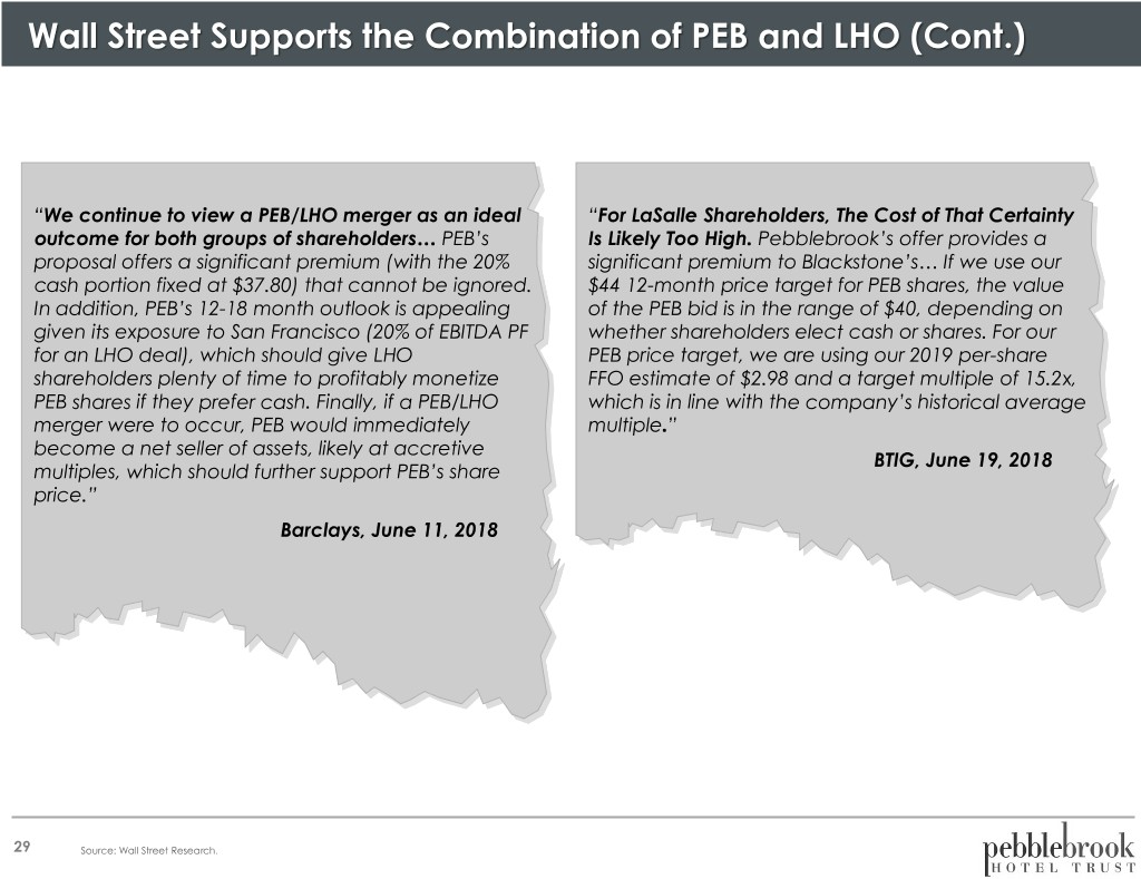 Wall Street Supports the Combination of PEB and LHO “We don’t see the LHO platform (65% independent/non- “In our opinion, this combination would create significant branded) as a logical combination with anyone other synergies and owner power… than PEB (57% independent). PEB and LHO have very similar portfolio orientations -- PEB…is familiar with the company’s assets and upper upscale/ luxury hotels, largely urban, boutique, operational platform—a clear benefit, in our view. heavily independent, and coastal foci. PEB's current CEO Jon Bortz was the former CEO of LHO and we believe Generally speaking, we think a $5-$6bn equity cap hotel PEB's leadership is highly capable to provide value to REIT appeals to a wider range of investors compared to LHO's portfolio with a relatively easy transition.” either company on a standalone basis ($2-$3bn).” SunTrust Robinson Humphrey, March 28, 2018 Deutsche Bank, March 28, 2018 “We view PEB’s proposed offer to acquire LHO as a potentially positive outcome for both sets of shareholders. PEB shareholders would benefit from a modestly “In our view the best explanation of the strategic merits of accretive deal and a larger portfolio (which increases a PEB-LHO combination can be found within the letter(s) asset recycling opportunities) while LHO shareholders PEB itself has sent to the LHO Board. Among the major would get access to a higher-multiple platform.” points, we briefly mention here: Significant overlap in Barclays, March 28, 2018 asset type & quality, geography, operating philosophy, etc.; increased trading liquidity in what would become the second largest lodging REIT by equity cap; corporate “Strategically, the deal makes sense, bringing together G&A synergies; increased balance sheet capacity, two similar portfolios in terms of price point (Upper- including potential sources of capital unavailable to Upscale hotels), geographic footprint (urban-focused in either company currently (e.g., public investment grade gateway cities), and quality (primarily nonbranded debt).” boutique hotels).” Evercore ISI, April 2, 2018 Green Street Advisors, April 24, 2018 28 Source: Wall Street Research.