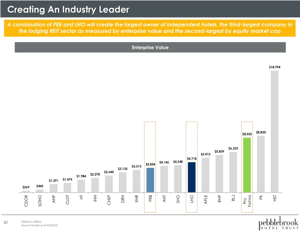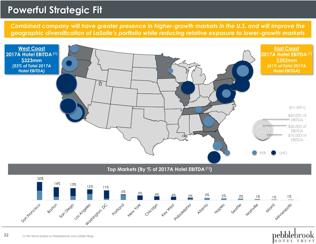 Creating An Industry Leader A combination of PEB and LHO will create the largest owner of independent hotels, the third-largest company in the lodging REIT sector as measured by enterprise value and the second-largest by equity market cap Enterprise Value $18,994 $8,830 $8,552 $6,323 $5,839 $5,412 $4,718 $4,146 $4,240 $3,834 $3,513 $3,135 $2,640 $2,270 $1,984 $1,291 $1,475 $269 $442 HT PK RLJ HST PEB INN AHT RHP XHR AHP LHO DRH SHO Pro APLE CLDT CHSP SOHO CDOR Forma 31 Dollars in millions Source: FacSet as of 8/8/2018