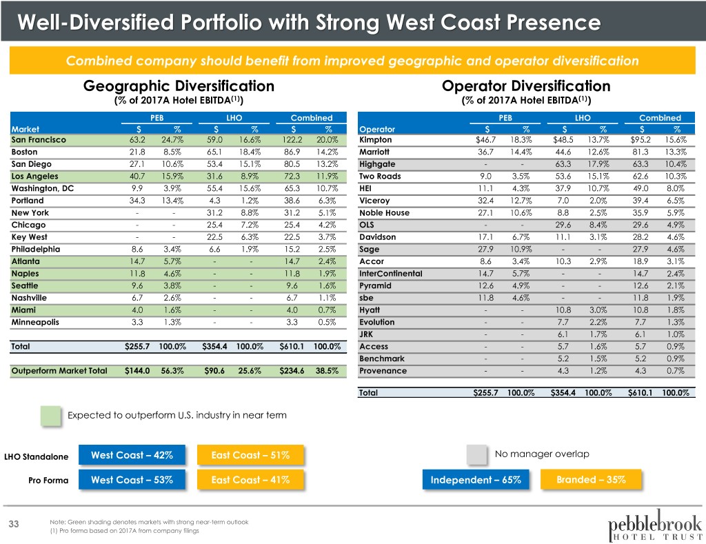 Powerful Strategic Fit Combined company will have greater presence in higher-growth markets in the U.S. and will improve the geographic diversification of LaSalle’s portfolio while reducing relative exposure to lower-growth markets West Coast East Coast 2017A Hotel EBITDA (1) 2017A Hotel EBITDA (1) $323mm $252mm (53% of Total 2017A (41% of Total 2017A Hotel EBITDA) Hotel EBITDA) ($ in 000’s) $60,000 of EBITDA $30,000 of EBITDA $10,000 of EBITDA PEB LHO Top Markets (By % of 2017A Hotel EBITDA (1)) 20% 14% 13% 12% 11% 6% 5% 4% 4% 2% 2% 2% 2% 1% 1% 1% 32 (1) Pro forma based on Pebblebrook and LaSalle filings