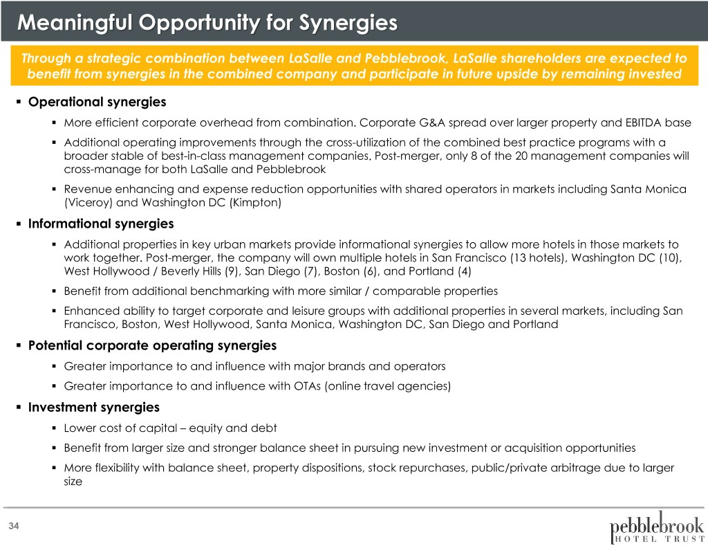 Well-Diversified Portfolio with Strong West Coast Presence Combined company should benefit from improved geographic and operator diversification Geographic Diversification Operator Diversification (% of 2017A Hotel EBITDA(1)) (% of 2017A Hotel EBITDA(1)) PEB LHO Combined PEB LHO Combined Market $ % $ % $ % Operator $ % $ % $ % San Francisco 63.2 24.7% 59.0 16.6% 122.2 20.0% Kimpton $46.7 18.3% $48.5 13.7% $95.2 15.6% Boston 21.8 8.5% 65.1 18.4% 86.9 14.2% Marriott 36.7 14.4% 44.6 12.6% 81.3 13.3% San Diego 27.1 10.6% 53.4 15.1% 80.5 13.2% Highgate - - 63.3 17.9% 63.3 10.4% Los Angeles 40.7 15.9% 31.6 8.9% 72.3 11.9% Two Roads 9.0 3.5% 53.6 15.1% 62.6 10.3% Washington, DC 9.9 3.9% 55.4 15.6% 65.3 10.7% HEI 11.1 4.3% 37.9 10.7% 49.0 8.0% Portland 34.3 13.4% 4.3 1.2% 38.6 6.3% Viceroy 32.4 12.7% 7.0 2.0% 39.4 6.5% New York - - 31.2 8.8% 31.2 5.1% Noble House 27.1 10.6% 8.8 2.5% 35.9 5.9% Chicago - - 25.4 7.2% 25.4 4.2% OLS - - 29.6 8.4% 29.6 4.9% Key West - - 22.5 6.3% 22.5 3.7% Davidson 17.1 6.7% 11.1 3.1% 28.2 4.6% Philadelphia 8.6 3.4% 6.6 1.9% 15.2 2.5% Sage 27.9 10.9% - - 27.9 4.6% Atlanta 14.7 5.7% - - 14.7 2.4% Accor 8.6 3.4% 10.3 2.9% 18.9 3.1% Naples 11.8 4.6% - - 11.8 1.9% InterContinental 14.7 5.7% - - 14.7 2.4% Seattle 9.6 3.8% - - 9.6 1.6% Pyramid 12.6 4.9% - - 12.6 2.1% Nashville 6.7 2.6% - - 6.7 1.1% sbe 11.8 4.6% - - 11.8 1.9% Miami 4.0 1.6% - - 4.0 0.7% Hyatt - - 10.8 3.0% 10.8 1.8% Minneapolis 3.3 1.3% - - 3.3 0.5% Evolution - - 7.7 2.2% 7.7 1.3% JRK - - 6.1 1.7% 6.1 1.0% Total $255.7 100.0% $354.4 100.0% $610.1 100.0% Access - - 5.7 1.6% 5.7 0.9% Benchmark - - 5.2 1.5% 5.2 0.9% Outperform Market Total $144.0 56.3% $90.6 25.6% $234.6 38.5% Provenance - - 4.3 1.2% 4.3 0.7% Total $255.7 100.0% $354.4 100.0% $610.1 100.0% Expected to outperform U.S. industry in near term LHO Standalone West Coast – 42% East Coast – 51% No manager overlap Pro Forma West Coast – 53% East Coast – 41% Independent – 65% Branded – 35% 33 Note: Green shading denotes markets with strong near-term outlook (1) Pro forma based on 2017A from company filings