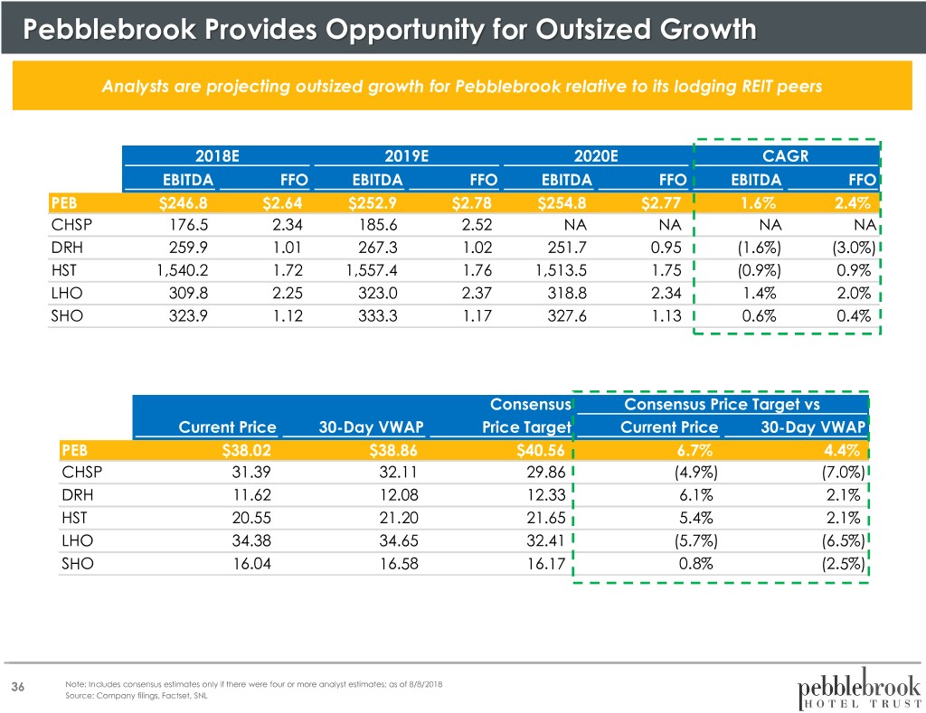 Significant Opportunity to Improve Hotel EBITDA Pebblebrook has significantly outperformed LaSalle on Hotel EBITDA Margin growth and Hotel EBITDA per key over the past 5 years Same-Property Hotel EBITDA Margin (1) Agg. Margin Improv. PEB LHO PEB Outperformance 2012A - 2017A 630 bps 90 bps 540 bps 2012A - 2018E 591 bps (110) bps 701 bps YoY Same-Property Improvement (2) (146) (220) 263 bps 113 bps 88 bps 19 bps 262 bps 101 bps 148 bps 118 bps 65 bps 37 bps (64) bps (50) bps bps bps 35.3% 33.2% 33.1% 33.5% 33.9% 33.7% 33.0% 33.4% 32.1% 32.2% 31.9% 31.0% 27.4% 28.3% 2012A 2013A 2014A 2015A 2016A 2017A 2018E Same-Property Hotel EBITDA per Key (1) CAGR PEB LHO PEB Outperformance Opportunity to improve LaSalle’s EBITDA 2012A - 2017A 7.1% 5.6% 151 bps per key based on PEB’s proven asset 2012A - 2018E 6.0% 3.2% 276 bps management approach and strategy YoY Same-Property (2) Improvement (4.7)% (4.0)% (0.9)% (7.8)% 16.7% 7.0% 8.4% 3.0% 16.3% 10.4% 7.6% 5.6% 4.2% 3.1% ~$5k per key x 10,452 rooms = $52.3mm of incremental EBITDA $39k $36k $37k $35k $35k $34k $33k $32k $33k $31k $26k $26k $28k $27k 2012A 2013A 2014A 2015A 2016A 2017A 2018E Source: Public filings Note: 2018E represents the midpoint of PEB guidance as of July 25, 2018 and midpoint of LHO Guidance as of May 10, 2018. (1) For PEB, based on properties defined in the Same-Property Inclusion Reference Table in each earnings release. For LHO, Hotel EBITDA margin based on the disclosed figure on the first page of each earnings release and Hotel EBITDA per Key 35 based on the FFO and EBITDA reconciliation in each earnings release and number of keys at the end of the period. LHO 2017A figures exclude Key West; 2018E Hotel EBITDA based on a midpoint of guidance of 31.0% Hotel EBITDA margin and $1,053.5mm Hotel Revenue as of May 10, 2018. (2) Margin improvement figures based on reported year over year Hotel EBITDA margin improvement. Hotel EBITDA per Key growth based on year-over-year growth of the comparable asset pool as reported each year.