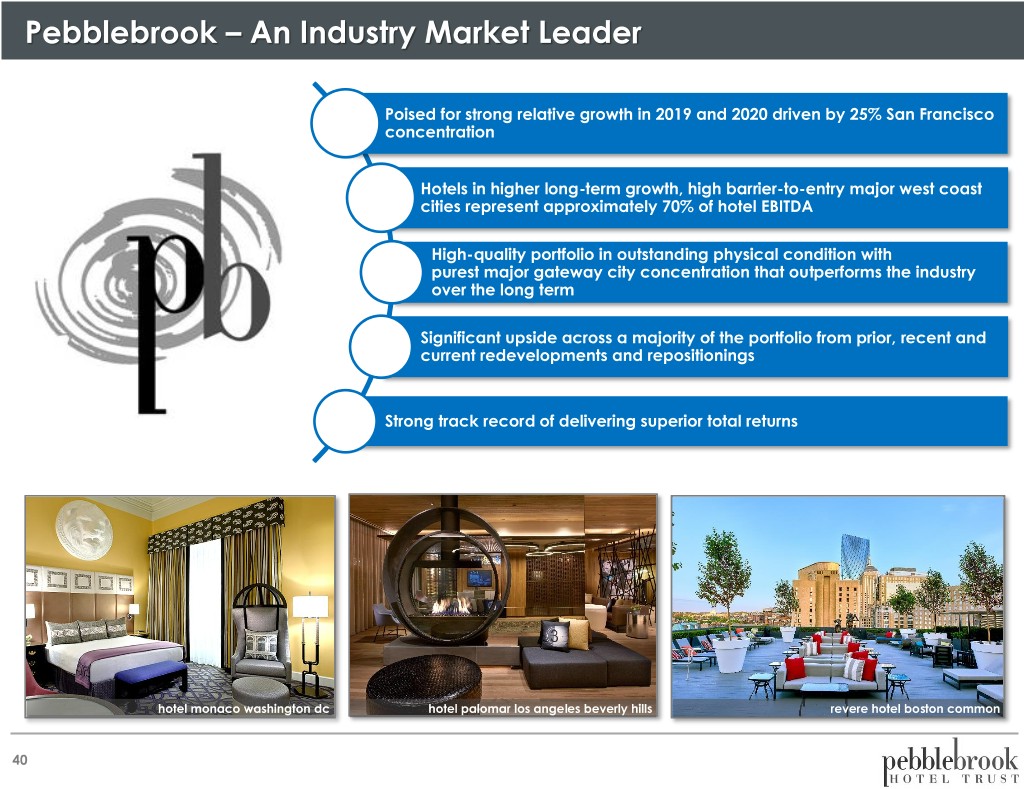 Pebblebrook – An Industry Market Leader Poised for strong relative growth in 2019 and 2020 driven by 25% San Francisco concentration Hotels in higher long-term growth, high barrier-to-entry major west coast cities represent approximately 70% of hotel EBITDA High-quality portfolio in outstanding physical condition with purest major gateway city concentration that outperforms the industry over the long term Significant upside across a majority of the portfolio from prior, recent and current redevelopments and repositionings Strong track record of delivering superior total returns hotel monaco washington dc hotel palomar los angeles beverly hills revere hotel boston common 40