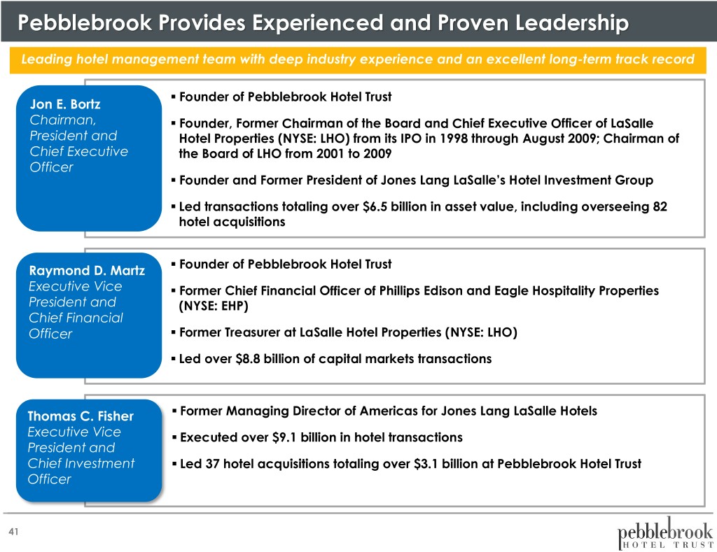 Pebblebrook Provides Experienced and Proven Leadership Leading hotel management team with deep industry experience and an excellent long-term track record . Founder of Pebblebrook Hotel Trust Jon E. Bortz Chairman, . Founder, Former Chairman of the Board and Chief Executive Officer of LaSalle President and Hotel Properties (NYSE: LHO) from its IPO in 1998 through August 2009; Chairman of Chief Executive the Board of LHO from 2001 to 2009 Officer . Founder and Former President of Jones Lang LaSalle’s Hotel Investment Group . Led transactions totaling over $6.5 billion in asset value, including overseeing 82 hotel acquisitions . Raymond D. Martz Founder of Pebblebrook Hotel Trust Executive Vice . Former Chief Financial Officer of Phillips Edison and Eagle Hospitality Properties President and (NYSE: EHP) Chief Financial . Officer Former Treasurer at LaSalle Hotel Properties (NYSE: LHO) . Led over $8.8 billion of capital markets transactions . Thomas C. Fisher Former Managing Director of Americas for Jones Lang LaSalle Hotels Executive Vice . Executed over $9.1 billion in hotel transactions President and Chief Investment . Led 37 hotel acquisitions totaling over $3.1 billion at Pebblebrook Hotel Trust Officer 41