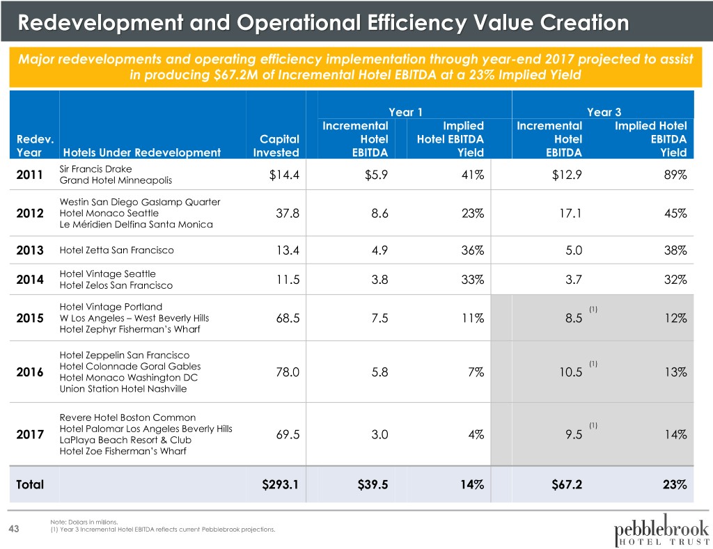 Redevelopment and Operational Efficiency Value Creation Major redevelopments and operating efficiency implementation through year-end 2017 projected to assist in producing $67.2M of Incremental Hotel EBITDA at a 23% Implied Yield Year 1 Year 3 Incremental Implied Incremental Implied Hotel Redev. Capital Hotel Hotel EBITDA Hotel EBITDA Year Hotels Under Redevelopment Invested EBITDA Yield EBITDA Yield Sir Francis Drake 2011 Grand Hotel Minneapolis $14.4 $5.9 41% $12.9 89% Westin San Diego Gaslamp Quarter 2012 Hotel Monaco Seattle 37.8 8.6 23% 17.1 45% Le Méridien Delfina Santa Monica 2013 Hotel Zetta San Francisco 13.4 4.9 36% 5.0 38% Hotel Vintage Seattle 2014 Hotel Zelos San Francisco 11.5 3.8 33% 3.7 32% Hotel Vintage Portland (1) 2015 W Los Angeles – West Beverly Hills 68.5 7.5 11% 8.5 12% Hotel Zephyr Fisherman’s Wharf Hotel Zeppelin San Francisco Hotel Colonnade Goral Gables (1) 2016 Hotel Monaco Washington DC 78.0 5.8 7% 10.5 13% Union Station Hotel Nashville Revere Hotel Boston Common Hotel Palomar Los Angeles Beverly Hills (1) 2017 LaPlaya Beach Resort & Club 69.5 3.0 4% 9.5 14% Hotel Zoe Fisherman’s Wharf Total $293.1 $39.5 14% $67.2 23% Note: Dollars in millions. 43 (1) Year 3 Incremental Hotel EBITDA reflects current Pebblebrook projections.