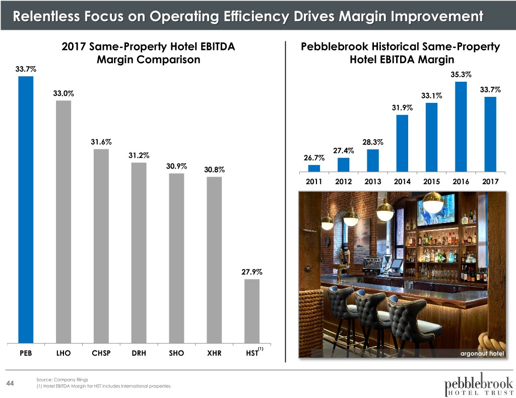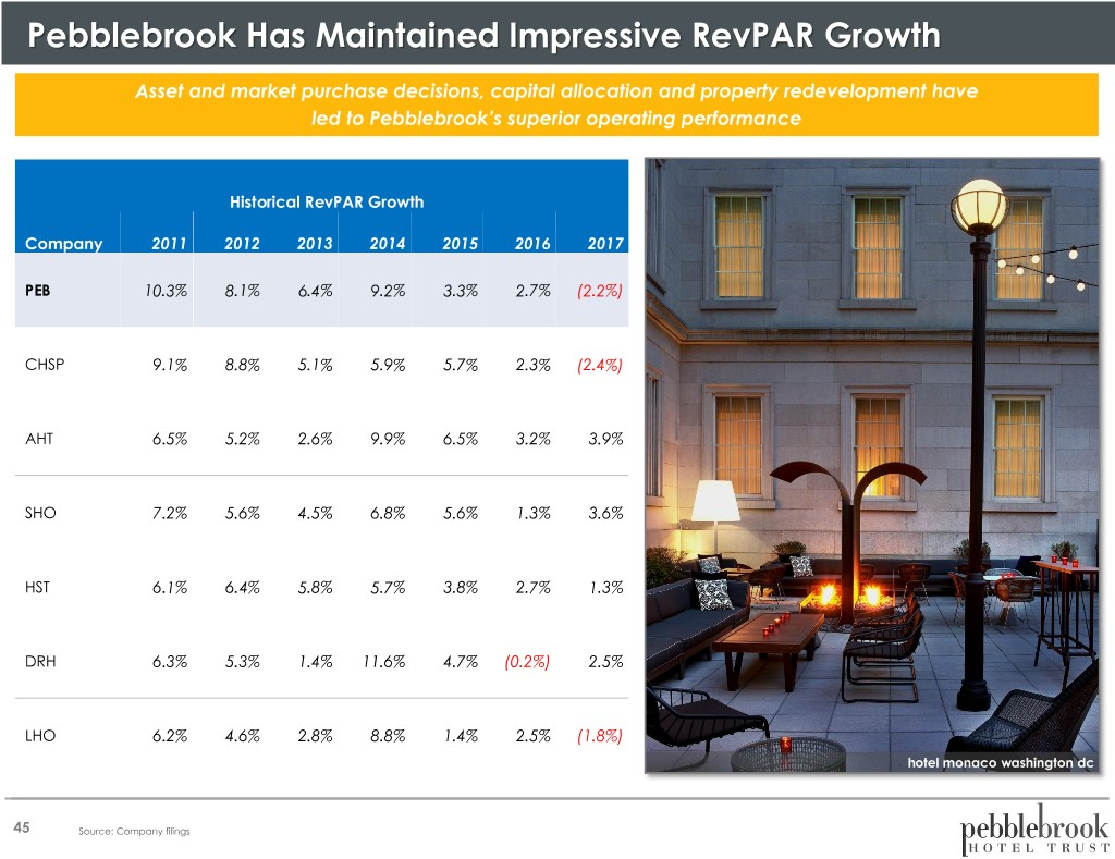 Relentless Focus on Operating Efficiency Drives Margin Improvement 2017 Same-Property Hotel EBITDA Pebblebrook Historical Same-Property Margin Comparison Hotel EBITDA Margin 33.7% 35.3% 33.7% 33.0% 33.1% 31.9% 31.6% 28.3% 27.4% 31.2% 26.7% 30.9% 30.8% 2011 2012 2013 2014 2015 2016 2017 27.9% (1) PEB LHO CHSP DRH SHO XHR HST argonaut hotel Source: Company filings 44 (1) Hotel EBITDA Margin for HST includes international properties.
