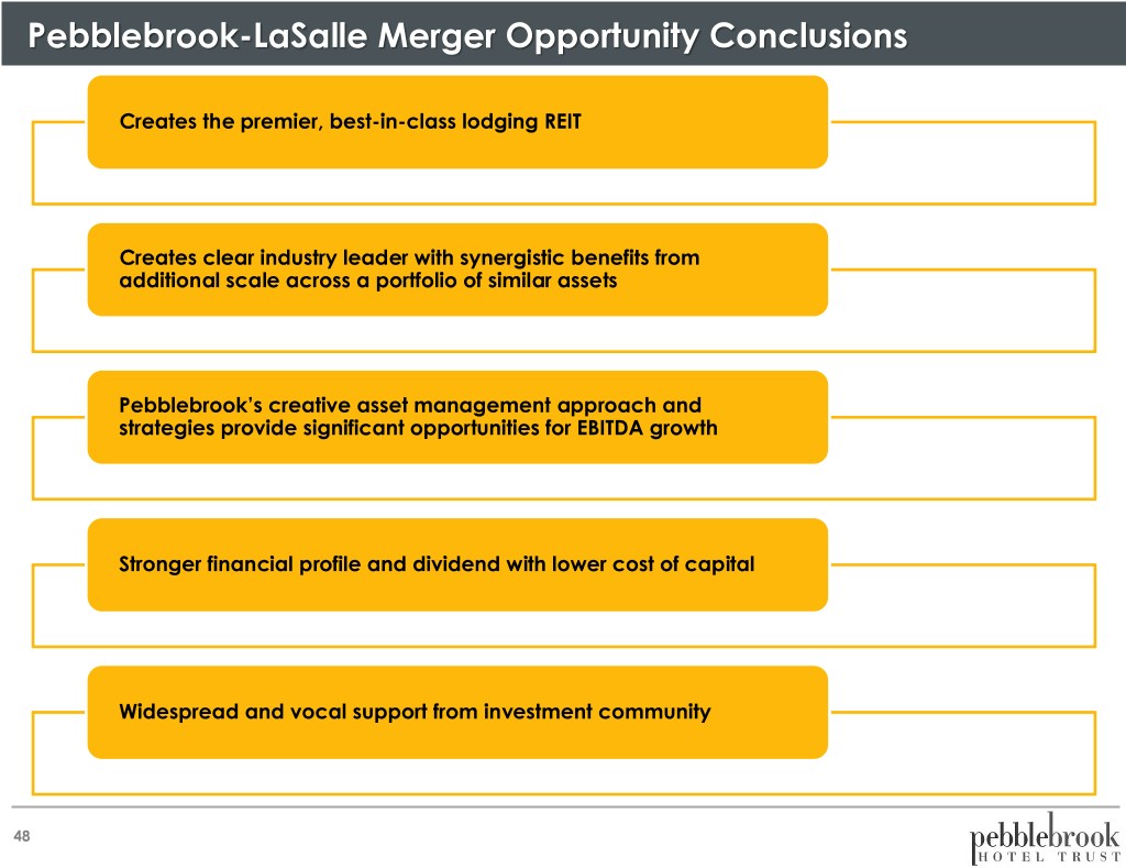 Pebblebrook-LaSalle Merger Opportunity Conclusions Creates the premier, best-in-class lodging REIT Creates clear industry leader with synergistic benefits from additional scale across a portfolio of similar assets Pebblebrook’s creative asset management approach and strategies provide significant opportunities for EBITDA growth Stronger financial profile and dividend with lower cost of capital Widespread and vocal support from investment community 48