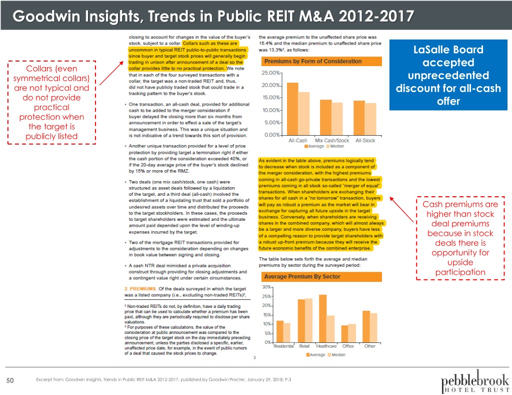 Goodwin Insights, Trends in Public REIT M&A 2012-2017 LaSalle Board accepted Collars (even symmetrical collars) unprecedented are not typical and discount for all-cash do not provide offer practical protection when the target is publicly listed Cash premiums are higher than stock deal premiums because in stock deals there is opportunity for upside participation 50 Excerpt from: Goodwin Insights, Trends in Public REIT M&A 2012-2017, published by Goodwin Procter, January 29, 2018, P.3