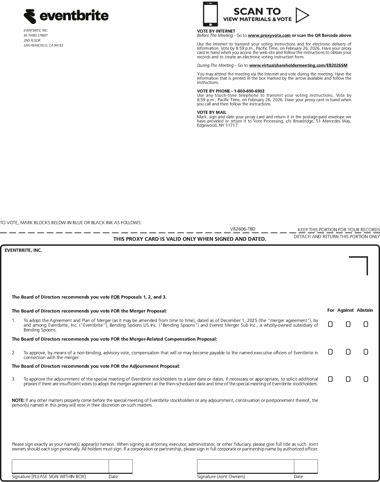 At the special meeting, you will be asked to consider and vote on a proposal to adopt the Agreement and Plan of Merger (as it may be amended from time to time), dated as of December 1, 2025, which we refer to as the merger agreement, by and among Eventbrite, Bending Spoons US Inc., a Delaware corporation and a wholly-owned subsidiary of Bending Spoons S.p.A., which we refer to as Bending Spoons, and Everest Merger Sub Inc., a wholly-owned subsidiary of Bending Spoons, which we refer to as Merger Sub. Pursuant to the terms of the merger agreement, Merger Sub will merge with and into Eventbrite, with Eventbrite surviving the merger as a wholly-owned subsidiary of Bending Spoons, which we refer to as the merger. You also will be asked to consider and vote on (i) a proposal to approve, by means of a non-binding, advisory vote, compensation that will or may become payable to the named executive officers of Eventbrite in connection with the merger and (ii) a proposal to approve one or more adjournments of the special meeting to a later date or dates, if necessary or appropriate, to solicit additional proxies if there are insufficient votes to adopt the merger agreement at the then-scheduled date and time of the special meeting.