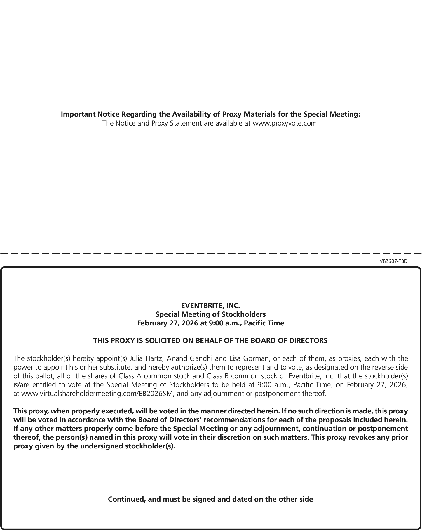 It is my pleasure to invite you to a special meeting of stockholders, which we refer to as the special meeting, of Eventbrite, Inc., a Delaware corporation, which we refer to as Eventbrite, to be held online at 9:00 a.m., Pacific Time, on February 27, 2026 at www.virtualshareholdermeeting.com/EB2026SM. I hope that you will be able to attend.