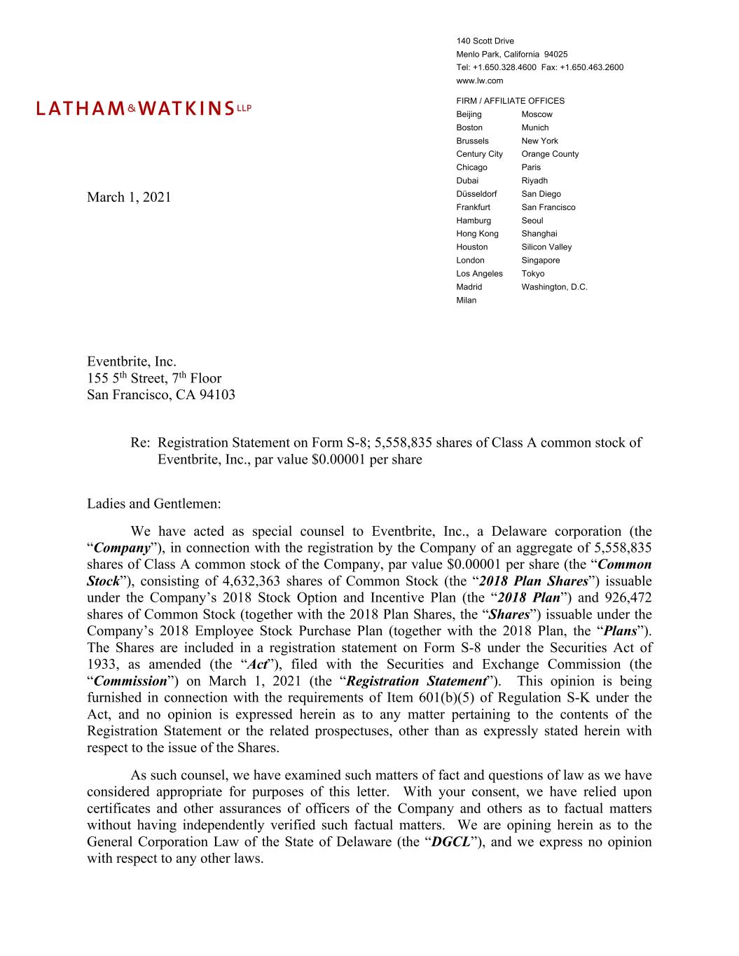 140 Scott Drive Menlo Park, California 94025 Tel: +1.650.328.4600 Fax: +1.650.463.2600 www.lw.com FIRM / AFFILIATE OFFICES Beijing Moscow Boston Munich Brussels New York Century City Orange County Chicago Paris Dubai Riyadh Düsseldorf San Diego Frankfurt San Francisco Hamburg Seoul Hong Kong Shanghai Houston Silicon Valley London Singapore Los Angeles Tokyo Madrid Washington, D.C. Milan March 1, 2021 Eventbrite, Inc. 155 5th Street, 7th Floor San Francisco, CA 94103 Re: Registration Statement on Form S-8; 5,558,835 shares of Class A common stock of Eventbrite, Inc., par value $0.00001 per share Ladies and Gentlemen: We have acted as special counsel to Eventbrite, Inc., a Delaware corporation (the “Company”), in connection with the registration by the Company of an aggregate of 5,558,835 shares of Class A common stock of the Company, par value $0.00001 per share (the “Common Stock”), consisting of 4,632,363 shares of Common Stock (the “2018 Plan Shares”) issuable under the Company’s 2018 Stock Option and Incentive Plan (the “2018 Plan”) and 926,472 shares of Common Stock (together with the 2018 Plan Shares, the “Shares”) issuable under the Company’s 2018 Employee Stock Purchase Plan (together with the 2018 Plan, the “Plans”). The Shares are included in a registration statement on Form S-8 under the Securities Act of 1933, as amended (the “Act”), filed with the Securities and Exchange Commission (the “Commission”) on March 1, 2021 (the “Registration Statement”). This opinion is being furnished in connection with the requirements of Item 601(b)(5) of Regulation S-K under the Act, and no opinion is expressed herein as to any matter pertaining to the contents of the Registration Statement or the related prospectuses, other than as expressly stated herein with respect to the issue of the Shares. As such counsel, we have examined such matters of fact and questions of law as we have considered appropriate for purposes of this letter. With your consent, we have relied upon certificates and other assurances of officers of the Company and others as to factual matters without having independently verified such factual matters. We are opining herein as to the General Corporation Law of the State of Delaware (the “DGCL”), and we express no opinion with respect to any other laws.