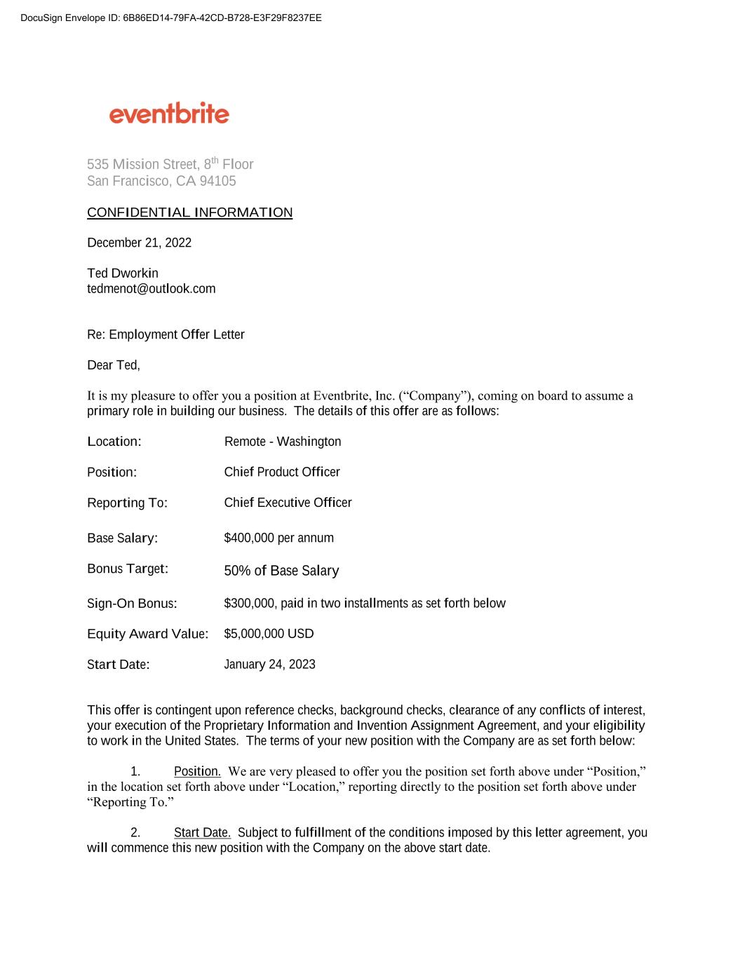 535 Mission Street, 8th Floor San Francisco, CA 94105 CONFIDENTIAL INFORMATION December 21, 2022 Ted Dworkin tedmenot@outlook.com Re: Employment Offer Letter Dear Ted, It is my pleasure to offer you a position at Eventbrite, Inc. (“Company”), coming on board to assume a primary role in building our business. The details of this offer are as follows: Location: Remote - Washington Position: Chief Product Officer Reporting To: Chief Executive Officer Base Salary: Bonus Target: $400,000 per annum 50% of Base Salary Sign-On Bonus: Equity Award Value: Start Date: $300,000, paid in two installments as set forth below $5,000,000 USD January 24, 2023 This offer is contingent upon reference checks, background checks, clearance of any conflicts of interest, your execution of the Proprietary Information and Invention Assignment Agreement, and your eligibility to work in the United States. The terms of your new position with the Company are as set forth below: 1. Position. We are very pleased to offer you the position set forth above under “Position,” in the location set forth above under “Location,” reporting directly to the position set forth above under “Reporting To.” 2. Start Date. Subject to fulfillment of the conditions imposed by this letter agreement, you will commence this new position with the Company on the above start date. DocuSign Envelope ID: 6B86ED14-79FA-42CD-B728-E3F29F8237EE