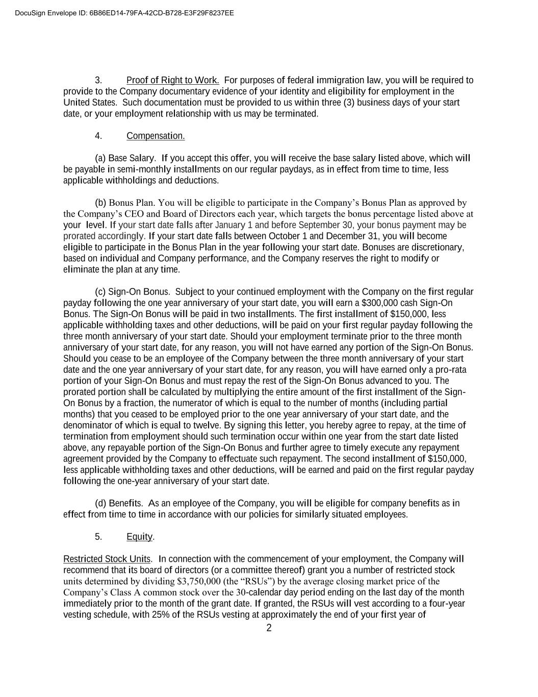 2 3. Proof of Right to Work. For purposes of federal immigration law, you will be required to provide to the Company documentary evidence of your identity and eligibility for employment in the United States. Such documentation must be provided to us within three (3) business days of your start date, or your employment relationship with us may be terminated. 4. Compensation. (a) Base Salary. If you accept this offer, you will receive the base salary listed above, which will be payable in semi-monthly installments on our regular paydays, as in effect from time to time, less applicable withholdings and deductions. (b) Bonus Plan. You will be eligible to participate in the Company’s Bonus Plan as approved by the Company’s CEO and Board of Directors each year, which targets the bonus percentage listed above at your level. If your start date falls after January 1 and before September 30, your bonus payment may be prorated accordingly. If your start date falls between October 1 and December 31, you will become eligible to participate in the Bonus Plan in the year following your start date. Bonuses are discretionary, based on individual and Company performance, and the Company reserves the right to modify or eliminate the plan at any time. (c) Sign-On Bonus. Subject to your continued employment with the Company on the first regular payday following the one year anniversary of your start date, you will earn a $300,000 cash Sign-On Bonus. The Sign-On Bonus will be paid in two installments. The first installment of $150,000, less applicable withholding taxes and other deductions, will be paid on your first regular payday following the three month anniversary of your start date. Should your employment terminate prior to the three month anniversary of your start date, for any reason, you will not have earned any portion of the Sign-On Bonus. Should you cease to be an employee of the Company between the three month anniversary of your start date and the one year anniversary of your start date, for any reason, you will have earned only a pro-rata portion of your Sign-On Bonus and must repay the rest of the Sign-On Bonus advanced to you. The prorated portion shall be calculated by multiplying the entire amount of the first installment of the Sign- On Bonus by a fraction, the numerator of which is equal to the number of months (including partial months) that you ceased to be employed prior to the one year anniversary of your start date, and the denominator of which is equal to twelve. By signing this letter, you hereby agree to repay, at the time of termination from employment should such termination occur within one year from the start date listed above, any repayable portion of the Sign-On Bonus and further agree to timely execute any repayment agreement provided by the Company to effectuate such repayment. The second installment of $150,000, less applicable withholding taxes and other deductions, will be earned and paid on the first regular payday following the one-year anniversary of your start date. (d) Benefits. As an employee of the Company, you will be eligible for company benefits as in effect from time to time in accordance with our policies for similarly situated employees. 5. Equity. Restricted Stock Units. In connection with the commencement of your employment, the Company will recommend that its board of directors (or a committee thereof) grant you a number of restricted stock units determined by dividing $3,750,000 (the “RSUs”) by the average closing market price of the Company’s Class A common stock over the 30-calendar day period ending on the last day of the month immediately prior to the month of the grant date. If granted, the RSUs will vest according to a four-year vesting schedule, with 25% of the RSUs vesting at approximately the end of your first year of DocuSign Envelope ID: 6B86ED14-79FA-42CD-B728-E3F29F8237EE