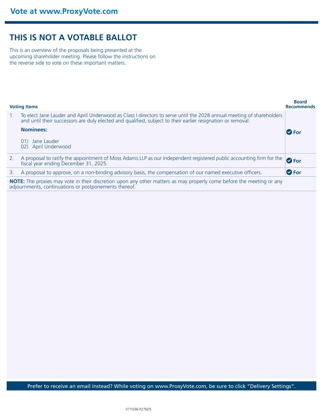 Vote at www.ProxyVote.com Prefer to receive an email instead? While voting on www.ProxyVote.com, be sure to click “Delivery Settings”. Voting Items Board Recommends V71038-P27605 THIS IS NOT A VOTABLE BALLOT This is an overview of the proposals being presented at the upcoming shareholder meeting. Please follow the instructions on the reverse side to vote on these important matters. 1. To elect Jane Lauder and April Underwood as Class I directors to serve until the 2028 annual meeting of shareholders and until their successors are duly elected and qualified, subject to their earlier resignation or removal: For Nominees: 01) Jane Lauder 02) April Underwood 2. A proposal to ratify the appointment of Moss Adams LLP as our independent registered public accounting firm for the fiscal year ending December 31, 2025. For 3. A proposal to approve, on a non-binding advisory basis, the compensation of our named executive officers. For NOTE: The proxies may vote in their discretion upon any other matters as may properly come before the meeting or any adjournments, continuations or postponements thereof.