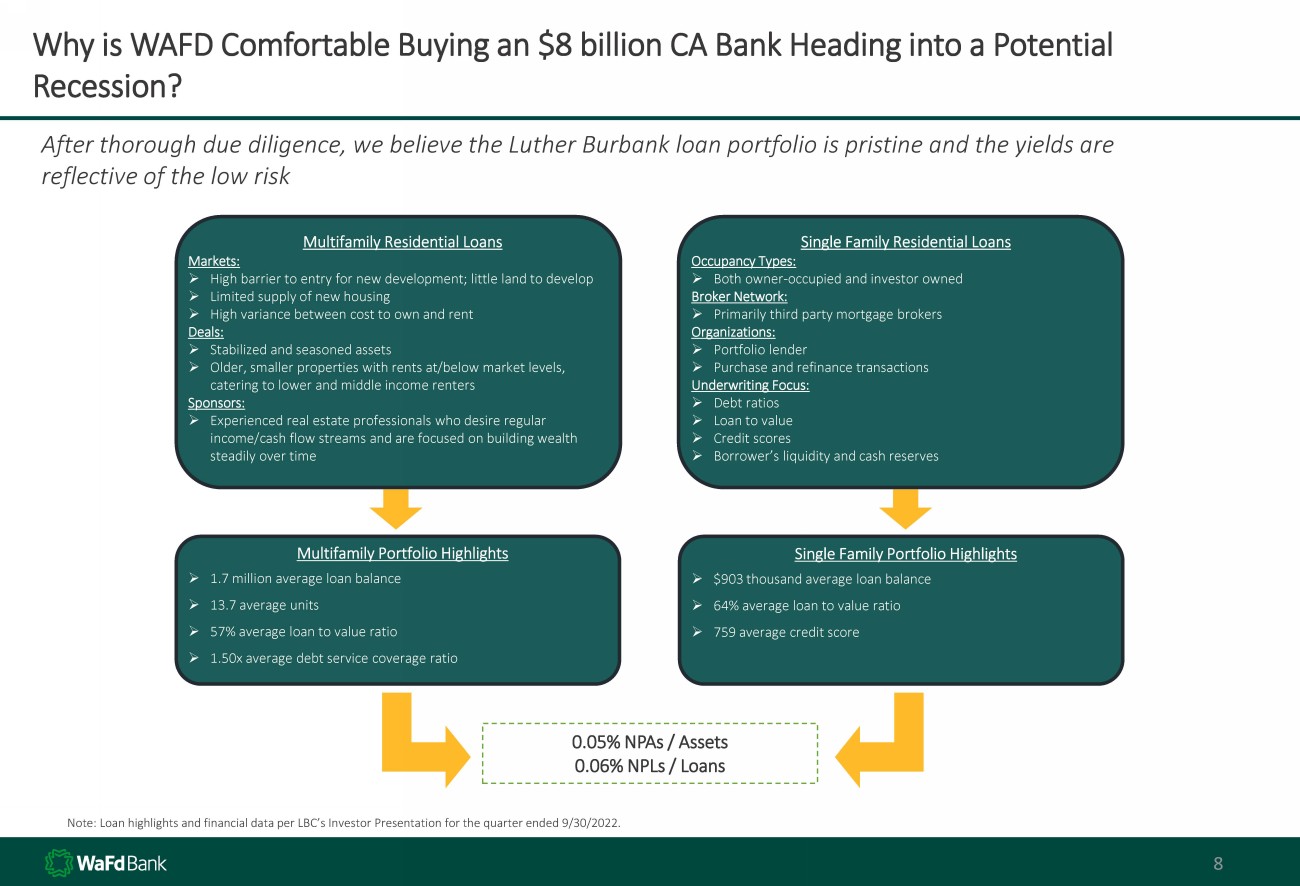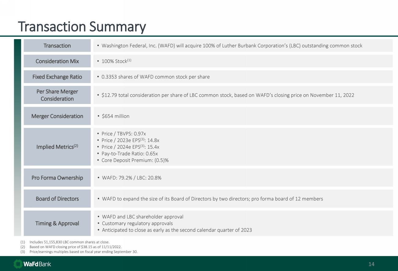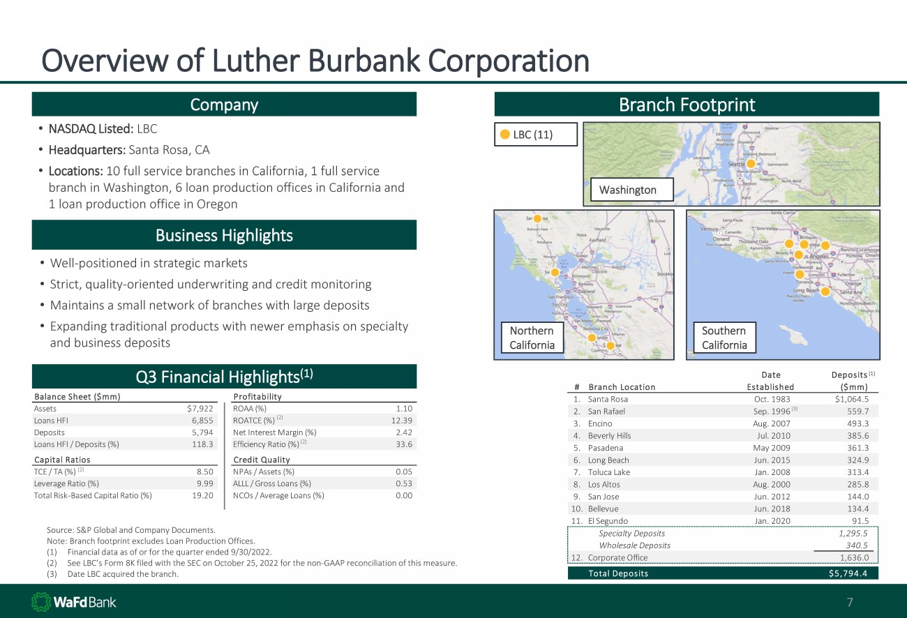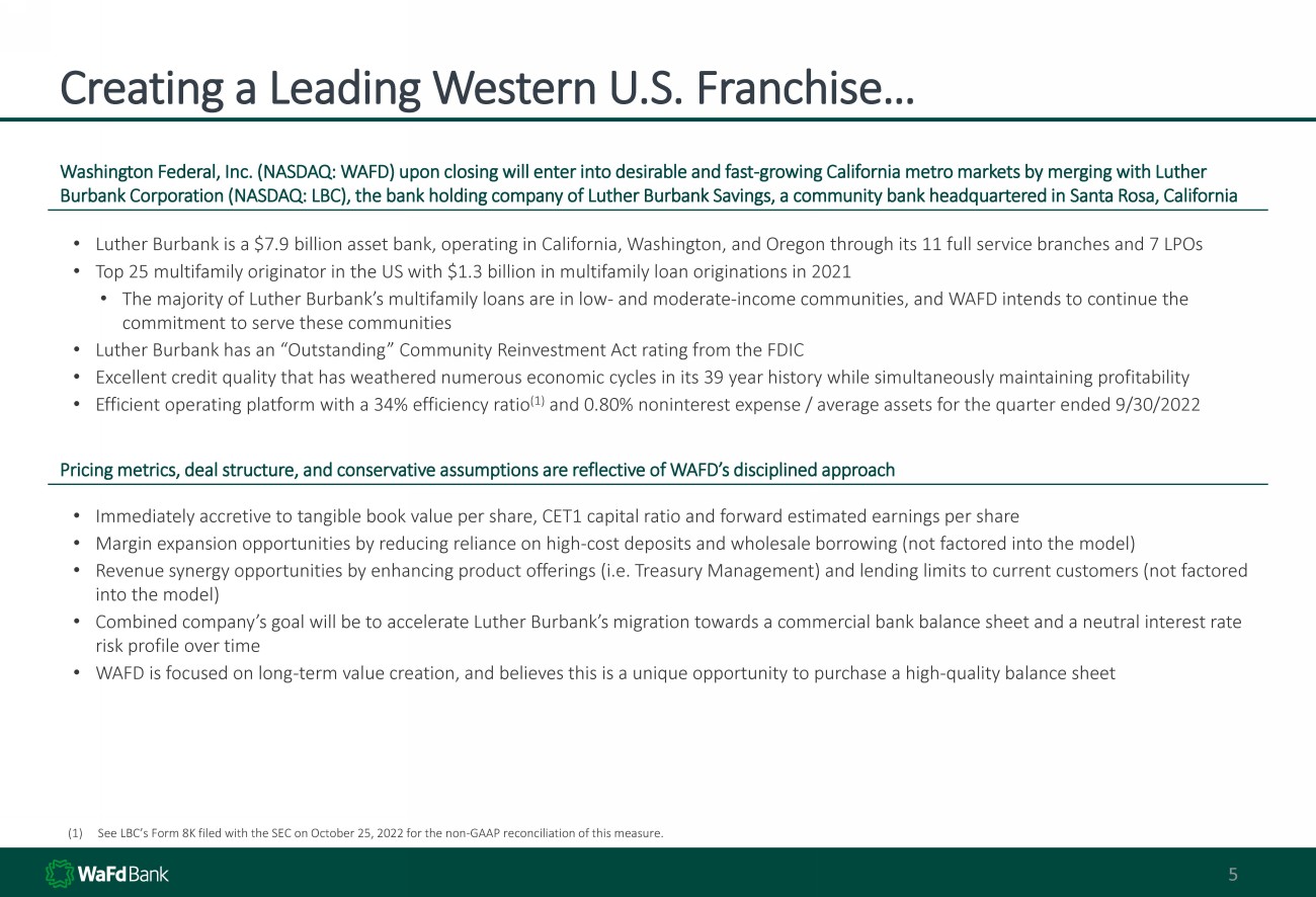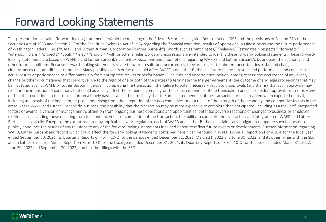 2 Forward Looking Statements This presentation contains “forward - looking statements” within the meaning of the Private Securities Litigation Reform Act of 19 95 and the provisions of Section 27A of the Securities Act of 1933 and Section 21E of the Securities Exchange Act of 1934 regarding the financial condition, results of o per ations, business plans and the future performance of Washington Federal, Inc. ("WAFD") and Luther Burbank Corporation ("Luther Burbank"). Words such as “anticipates,” “believe s,” “estimates,” “expects,” “forecasts,” “intends,” “plans,” “projects,” “could,” “may,” “should,” “will” or other similar words and expressions are intended to ident ify these forward - looking statements. These forward - looking statements are based on WAFD’s and Luther Burbank’s current expectations and assumptions regarding WAFD’s and Luther Burbank’s businesses, the economy, and other future conditions. Because forward - looking statements relate to future results and occurrences, they are subject to inhere nt uncertainties, risks, and changes in circumstances that are difficult to predict. Many possible events or factors could affect WAFD’s or Luther Burbank’s future financial results and performance and could cause actual results or performance to differ materially from anticipated results or performance. Such risks and uncertainties incl ude , among others: the occurrence of any event, change or other circumstances that could give rise to the right of one or both of the parties to terminate the Merger Agreeme nt, the outcome of any legal proceedings that may be instituted against WAFD or Luther Burbank, delays in completing the transaction, the failure to obtain necessary regulatory approvals (and the risk that such approvals may result in the imposition of conditions that could adversely affect the combined company or the expected benefits of the trans act ion) and shareholder approvals or to satisfy any of the other conditions to the transaction on a timely basis or at all, the possibility that the anticipated benefits of the tra nsaction are not realized when expected or at all, including as a result of the impact of, or problems arising from, the integration of the two companies or as a result of the str ength of the economy and competitive factors in the areas where WAFD and Luther Burbank do business, the possibility that the transaction may be more expensive to complete than anticipated, including as a result o f u nexpected factors or events, diversion of management’s attention from ongoing business operations and opportunities, potential adverse rea ctions or changes to business or employee relationships, including those resulting from the announcement or completion of the transaction, the ability to complete the tra nsaction and integration of WAFD and Luther Burbank successfully. Except to the extent required by applicable law or regulation, each of WAFD and Luther Burbank disclaims any obligation to update such factors or to publicly announce the results of any revisions to any of the forward - looking statements included herein to reflect future events or developments. Further information regarding WAFD, Luther Burbank and factors which could affect the forward - looking statements contained herein can be found in WAFD’s Annual Report on Form 10 - K for the fiscal year ended September 30, 2021, its Quarterly Reports on Form 10 - Q for the periods ended December 31, 2021, March 31, 2022 and June 30 , 2022, and its other filings with the SEC, and in Luther Burbank’s Annual Report on Form 10 - K for the fiscal year ended December 31, 2021, its Quarterly Reports on Form 10 - Q for the periods ended March 31, 2022, June 30, 2022 and September 30, 2022, and its other filings with the SEC.