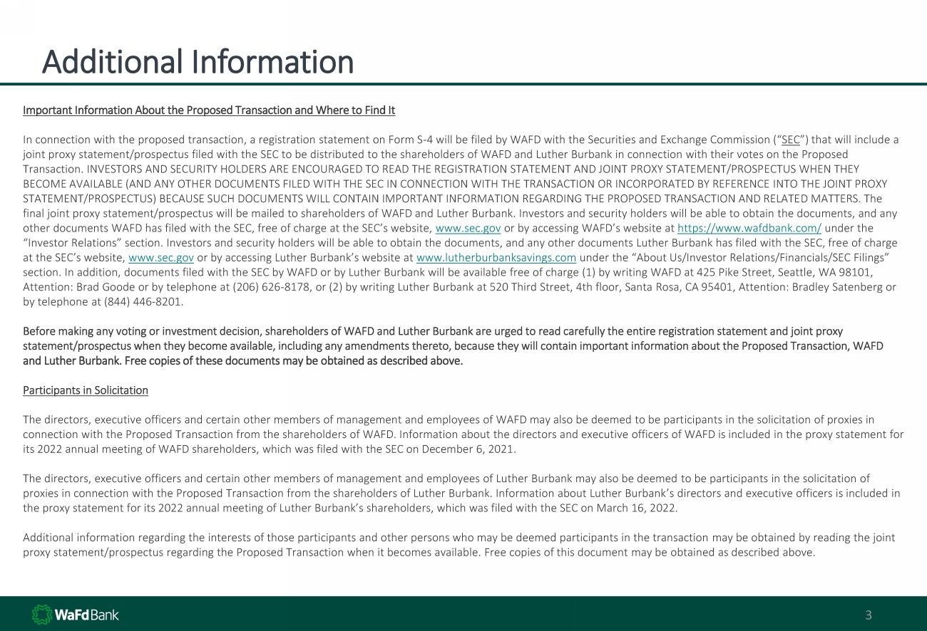3 Additional Information Important Information About the Proposed Transaction and Where to Find It In connection with the proposed transaction, a registration statement on Form S - 4 will be filed by WAFD with the Securities and Exc hange Commission (“ SEC ”) that will include a joint proxy statement/prospectus filed with the SEC to be distributed to the shareholders of WAFD and Luther Burbank in connection with their votes on the Proposed Transaction. INVESTORS AND SECURITY HOLDERS ARE ENCOURAGED TO READ THE REGISTRATION STATEMENT AND JOINT PROXY STATEMENT/PROSP ECT US WHEN THEY BECOME AVAILABLE (AND ANY OTHER DOCUMENTS FILED WITH THE SEC IN CONNECTION WITH THE TRANSACTION OR INCORPORATED BY REFERENCE INT O THE JOINT PROXY STATEMENT/PROSPECTUS) BECAUSE SUCH DOCUMENTS WILL CONTAIN IMPORTANT INFORMATION REGARDING THE PROPOSED TRANSACTION AND RELATE D M ATTERS. The final joint proxy statement/prospectus will be mailed to shareholders of WAFD and Luther Burbank. Investors and security holders will be able to obtain the documents, and any other documents WAFD has filed with the SEC, free of charge at the SEC’s website, www.sec.gov or by accessing WAFD’s website at https://www.wafdbank.com/ under the “Investor Relations” section . Investors and security holders will be able to obtain the documents, and any other documents Luther Burbank has filed with the SEC, fre e o f charge at the SEC’s website, www.sec.gov or by accessing Luther Burbank’s website at www.lutherburbanksavings.com under the “About Us/Investor Relations/Financials/SEC Filings” section. In addition, documents filed with the SEC by WAFD or by Luther Burbank will be available free of charge (1) by writing WAFD at 425 Pike Street, Seattle, WA 98101, Attention: Brad Goode or by telephone at (206) 626 - 8178, or (2) by writing Luther Burbank at 520 Third Street, 4th floor, Santa Rosa, CA 95401, Attention: Bradley Satenberg or by telephone at (844) 446 - 8201. Before making any voting or investment decision, shareholders of WAFD and Luther Burbank are urged to read carefully the entire registration statement and joint proxy statement/prospectus when they become available, including any amendments thereto, because they will contain important inform ati on about the Proposed Transaction, WAFD and Luther Burbank. Free copies of these documents may be obtained as described above . Participants in Solicitation The directors, executive officers and certain other members of management and employees of WAFD may also be deemed to be part ici pants in the solicitation of proxies in connection with the Proposed Transaction from the shareholders of WAFD. Information about the directors and executive officer s o f WAFD is included in the proxy statement for its 2022 annual meeting of WAFD shareholders, which was filed with the SEC on December 6, 2021 . The directors, executive officers and certain other members of management and employees of Luther Burbank may also be deemed to be participants in the solicitation of proxies in connection with the Proposed Transaction from the shareholders of Luther Burbank. Information about Luther Burbank ’s directors and executive officers is included in the proxy statement for its 2022 annual meeting of Luther Burbank’s shareholders, which was filed with the SEC on March 16, 2 022 . Additional information regarding the interests of those participants and other persons who may be deemed participants in the transaction ma y be obtained by reading the joint proxy statement/prospectus regarding the Proposed Transaction when it becomes available. Free copies of this document may be obt ained as described above .