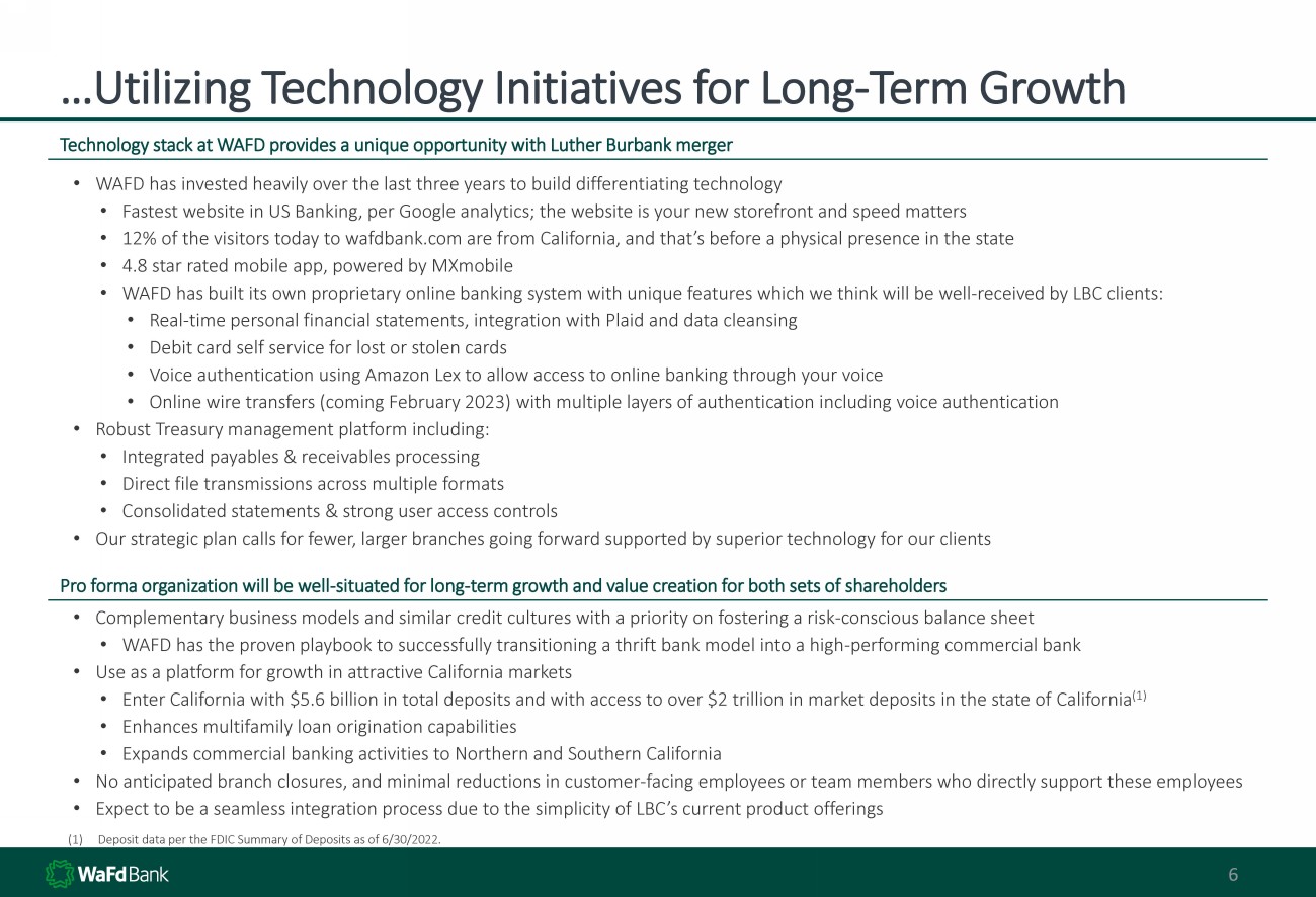 5 Creating a Leading Western U.S. Franchise… • Luther Burbank is a $7.9 billion asset bank, operating in California, Washington, and Oregon through its 11 full service branches and 7 LPOs • Top 25 multifamily originator in the US with $1.3 billion in multifamily loan originations in 2021 • The majority of Luther Burbank’s multifamily loans are in low - and moderate - income communities, and WAFD intends to continue the commitment to serve these communities • Luther Burbank has an “Outstanding” Community Reinvestment Act rating from the FDIC • Excellent credit quality that has weathered numerous economic cycles in its 39 year history while simultaneously maintaining profitabil ity • Efficient operating platform with a 34% efficiency ratio (1) and 0.80% noninterest expense / average assets for the quarter ended 9/30/2022 Washington Federal, Inc. (NASDAQ: WAFD) upon closing will enter into desirable and fast - growing California metro markets by merg ing with Luther Burbank Corporation (NASDAQ: LBC), the bank holding company of Luther Burbank Savings, a community bank headquartered in Sant a R osa, California • Immediately accretive to tangible book value per share, CET1 capital ratio and forward estimated earnings per share • Margin expansion opportunities by reducing reliance on high - cost deposits and wholesale borrowing (not factored into the model) • Revenue synergy opportunities by enhancing product offerings ( i.e. Treasury Management) and lending limits to current customers (not factored into the model) • Combined company’s goal will be to accelerate Luther Burbank’s migration towards a commercial bank balance sheet and a neutral interest rate risk profile over time • WAFD is focused on long - term value creation, and believes this is a unique opportunity to purchase a high - quality balance sheet Pricing metrics, deal structure, and conservative assumptions are reflective of WAFD’s disciplined approach (1) See LBC’s Form 8K filed with the SEC on October 25, 2022 for the non - GAAP reconciliation of this measure.