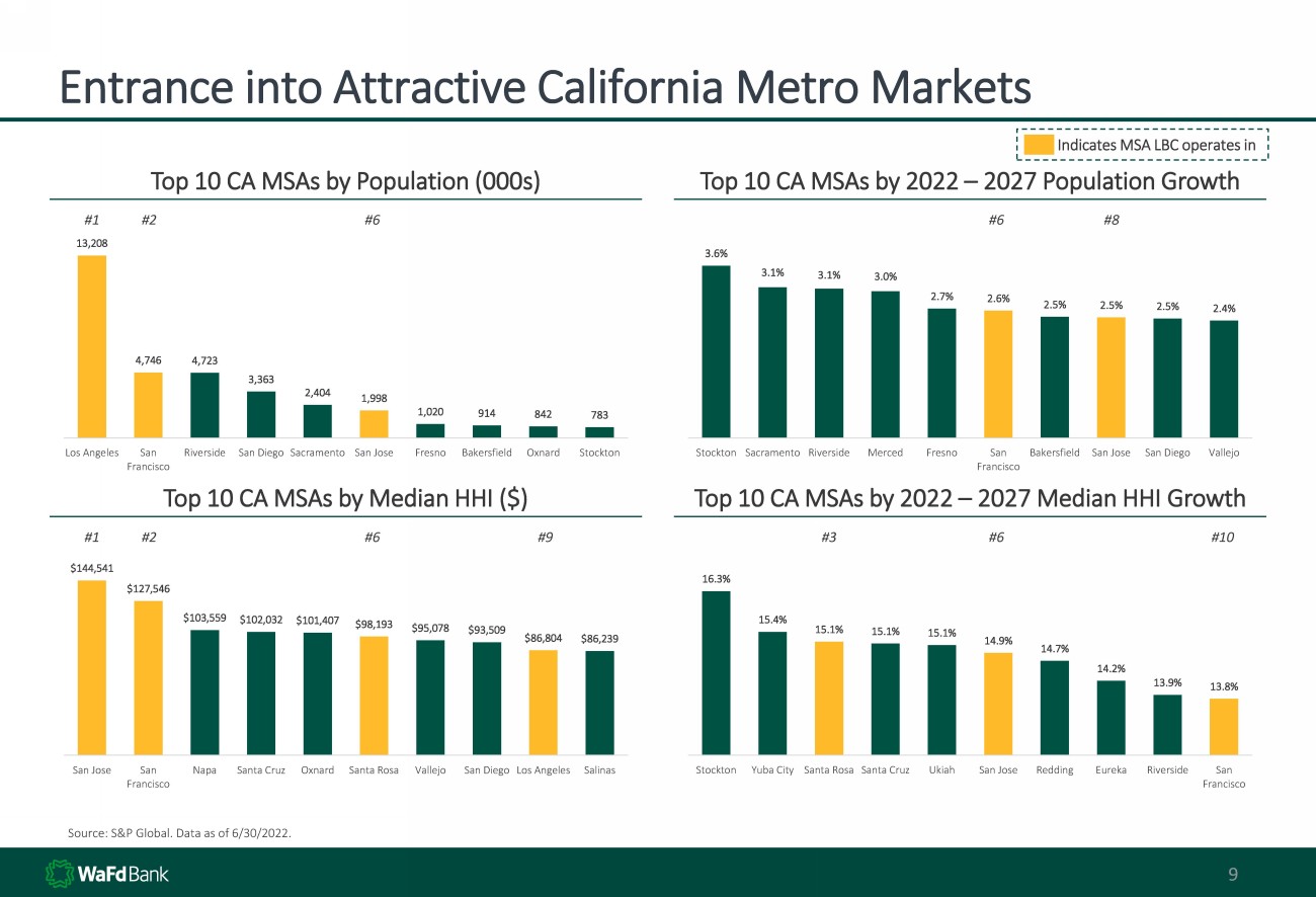 8 Multifamily Portfolio Highlights » 1.7 million average loan balance » 13.7 average units » 57% average loan to value ratio » 1.50x average debt service coverage ratio Why is WAFD Comfortable Buying an $8 billion CA Bank Heading into a Potential Recession ? Multifamily Residential Loans Markets: » High barrier to entry for new development; little land to develop » Limited supply of new housing » High variance between cost to own and rent Deals: » Stabilized and seasoned assets » Older, smaller properties with rents at/below market levels, catering to lower and middle income renters Sponsors: » Experienced real estate professionals who desire regular income/cash flow streams and are focused on building wealth steadily over time Single Family Residential Loans Occupancy Types: » Both owner - occupied and investor owned Broker Network: » Primarily third party mortgage brokers Organizations: » Portfolio lender » Purchase and refinance transactions Underwriting Focus: » Debt ratios » Loan to value » Credit scores » Borrower’s liquidity and cash reserves (2) (1) Single Family Portfolio Highlights » $903 thousand average loan balance » 64% average loan to value ratio » 759 average credit score 0.05% NPAs / Assets 0.06% NPLs / Loans After thorough due diligence, we believe the Luther Burbank loan portfolio is pristine and the yields are reflective of the low risk Note: Loan highlights and financial data per LBC’s Investor Presentation for the quarter ended 9/30/2022.