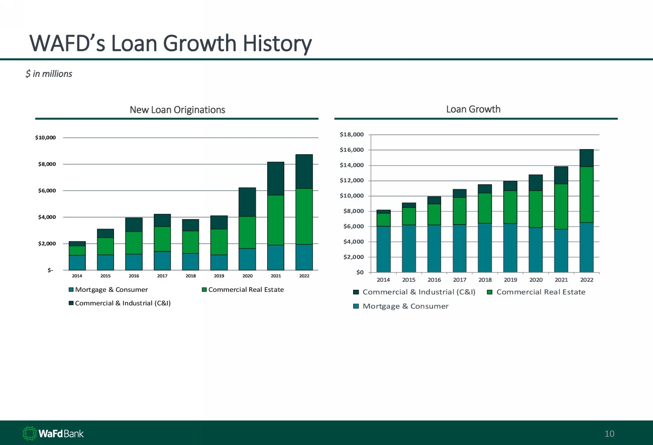 9 Entrance into Attractive California Metro Markets Source: S&P Global. Data as of 6/30/2022. Indicates MSA LBC operates in $144,541 $127,546 $103,559 $102,032 $101,407 $98,193 $95,078 $93,509 $86,804 $86,239 San Jose San Francisco Napa Santa Cruz Oxnard Santa Rosa Vallejo San Diego Los Angeles Salinas Top 10 CA MSAs by Population (000s) Top 10 CA MSAs by 2022 – 2027 Population Growth Top 10 CA MSAs by Median HHI ($) Top 10 CA MSAs by 2022 – 2027 Median HHI Growth 13,208 4,746 4,723 3,363 2,404 1,998 1,020 914 842 783 Los Angeles San Francisco Riverside San Diego Sacramento San Jose Fresno Bakersfield Oxnard Stockton #1 #2 #6 #1 #2 #9 #6 16.3% 15.4% 15.1% 15.1% 15.1% 14.9% 14.7% 14.2% 13.9% 13.8% Stockton Yuba City Santa Rosa Santa Cruz Ukiah San Jose Redding Eureka Riverside San Francisco #3 #10 #6 3.6% 3.1% 3.1% 3.0% 2.7% 2.6% 2.5% 2.5% 2.5% 2.4% Stockton Sacramento Riverside Merced Fresno San Francisco Bakersfield San Jose San Diego Vallejo #8 #6