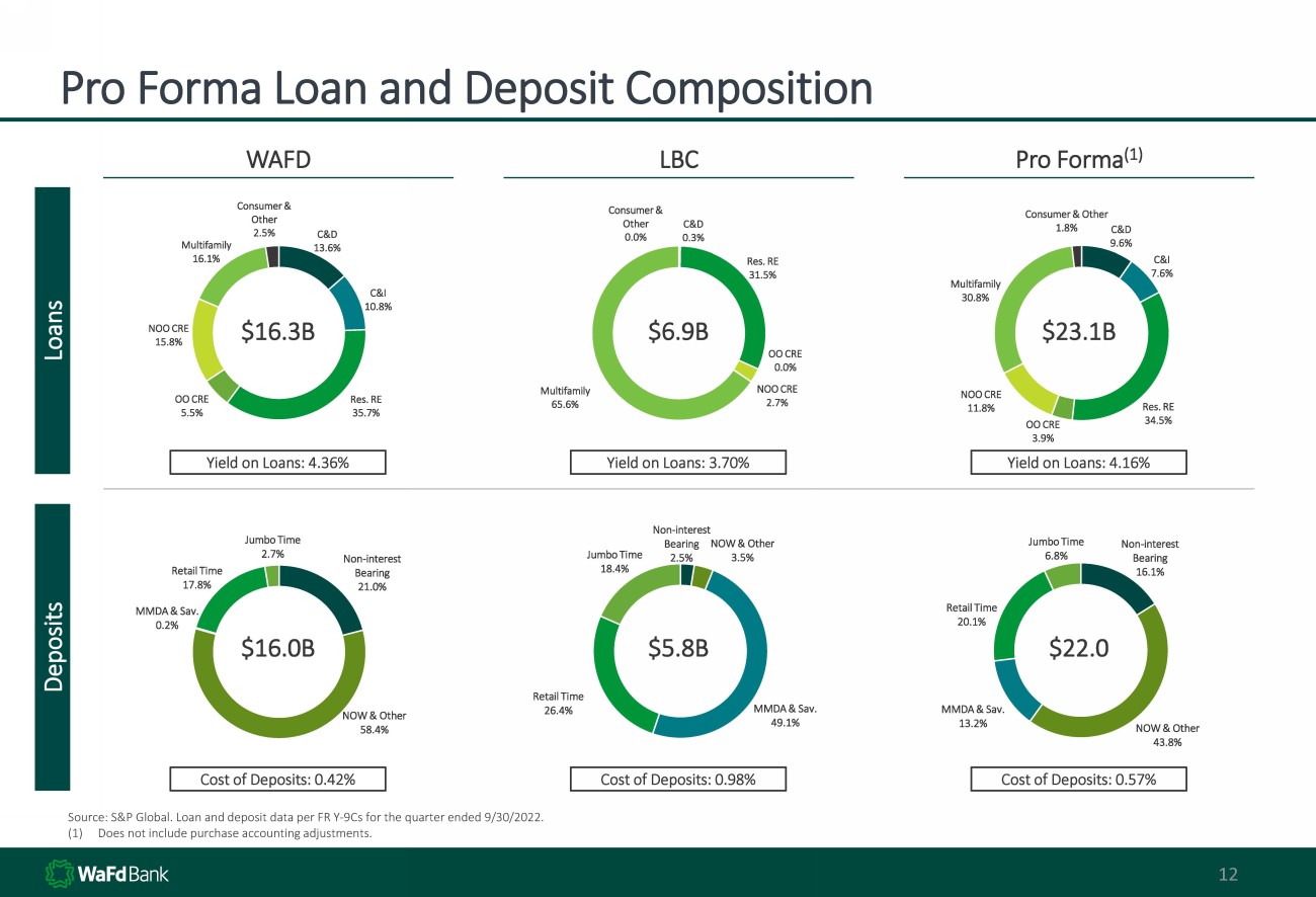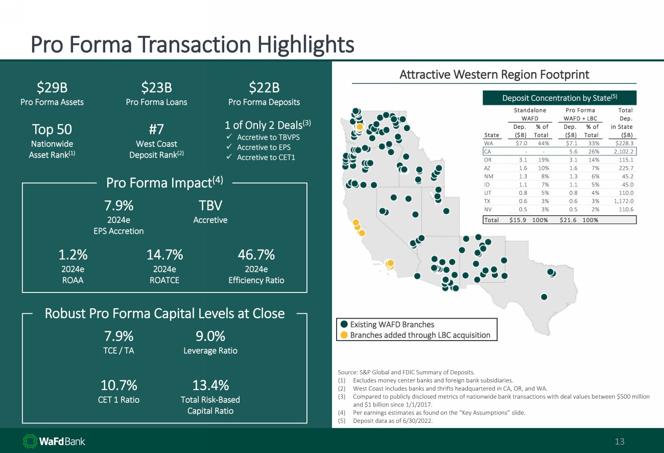 12 Pro Forma Loan and Deposit Composition Source: S&P Global. Loan and deposit data per FR Y - 9Cs for the quarter ended 9/30/2022. (1) Does not include purchase accounting adjustments. Loans Deposits C&D 9.6% C&I 7.6% Res. RE 34.5% OO CRE 3.9% NOO CRE 11.8% Multifamily 30.8% Consumer & Other 1.8% Non - interest Bearing 16.1% NOW & Other 43.8% MMDA & Sav. 13.2% Retail Time 20.1% Jumbo Time 6.8% Pro Forma (1) $23.1B $22.0 Yield on Loans: 4.16% Cost of Deposits: 0.57% C&D 0.3% Res. RE 31.5% OO CRE 0.0% NOO CRE 2.7% Multifamily 65.6% Consumer & Other 0.0% Non - interest Bearing 2.5% NOW & Other 3.5% MMDA & Sav. 49.1% Retail Time 26.4% Jumbo Time 18.4% $6.9B $5.8B Yield on Loans: 3.70% Cost of Deposits: 0.98% LBC C&D 13.6% C&I 10.8% Res. RE 35.7% OO CRE 5.5% NOO CRE 15.8% Multifamily 16.1% Consumer & Other 2.5% Non - interest Bearing 21.0% NOW & Other 58.4% MMDA & Sav. 0.2% Retail Time 17.8% Jumbo Time 2.7% $16.3B $ 16.0B Yield on Loans: 4.36% Cost of Deposits: 0.42% WAFD