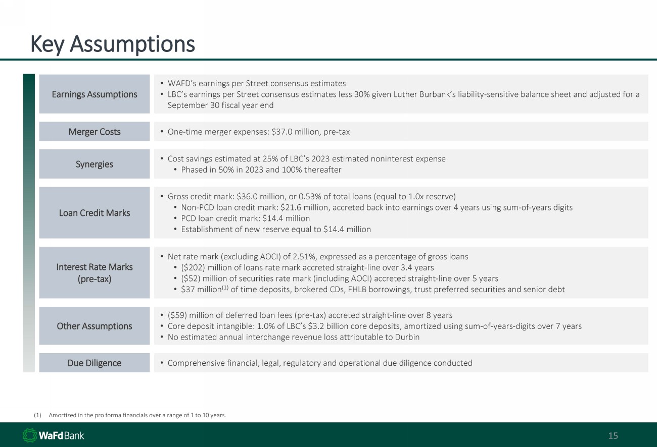 14 Transaction Summary (1) Includes 51,155,830 LBC common shares at close. (2) Based on WAFD closing price of $38.15 as of 11/11/2022. (3) Price/earnings multiples based on fiscal year ending September 30 . Transaction • Washington Federal, Inc. (WAFD) will acquire 100% of Luther Burbank Corporation’s (LBC) outstanding common stock Consideration Mix • 100% Stock (1) Fixed Exchange Ratio • 0.3353 shares of WAFD common stock per share Per Share Merger Consideration • $12.79 total consideration per share of LBC common stock, based on WAFD’s closing price on November 11, 2022 Merger Consideration • $654 million Implied Metrics (2) • Price / TBVPS: 0.97x • Price / 2023e EPS (3) : 14.8x • Price / 2024e EPS (3) : 15.4x • Pay - to - Trade Ratio: 0.65x • Core Deposit Premium: (0.5)% Pro Forma Ownership • WAFD: 79.2% / LBC: 20.8% Board of Directors • WAFD to expand the size of its Board of Directors by two directors; pro forma board of 12 members Timing & Approval • WAFD and LBC shareholder approval • Customary regulatory approvals • Anticipated to close as early as the second calendar quarter of 2023